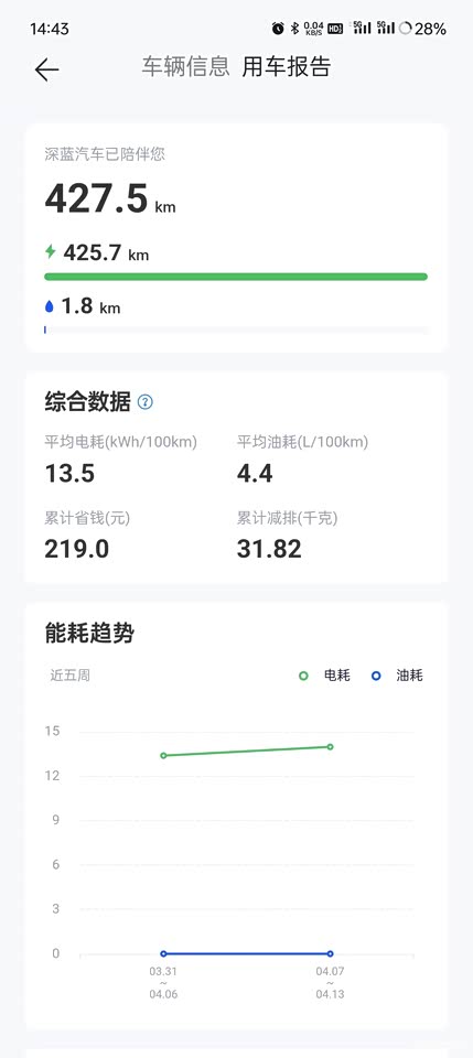 提车到现在开了差不多400km了,基本都是上下班开,每天上下班55km,基本上开3天充一次电,到现在充了两回,能耗13.6左右,我算了一下,基本上续航没打折,能达到官方宣传的200km,就是不知道冬天怎么样,后面再看看。比较遗憾的是我家的车位不允许安装充电桩,用车成本又增加了。