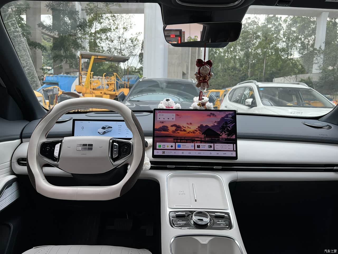 内饰现阶段吉利走统一风格设计,大小屏。仁者见仁 智者见智,内饰上能摸到的全是皮革软包,白色内饰很上档次,就是不耐脏,座椅又买了套白色皮革垫子。新车味道稍微有点大,目前上车需要透风一下