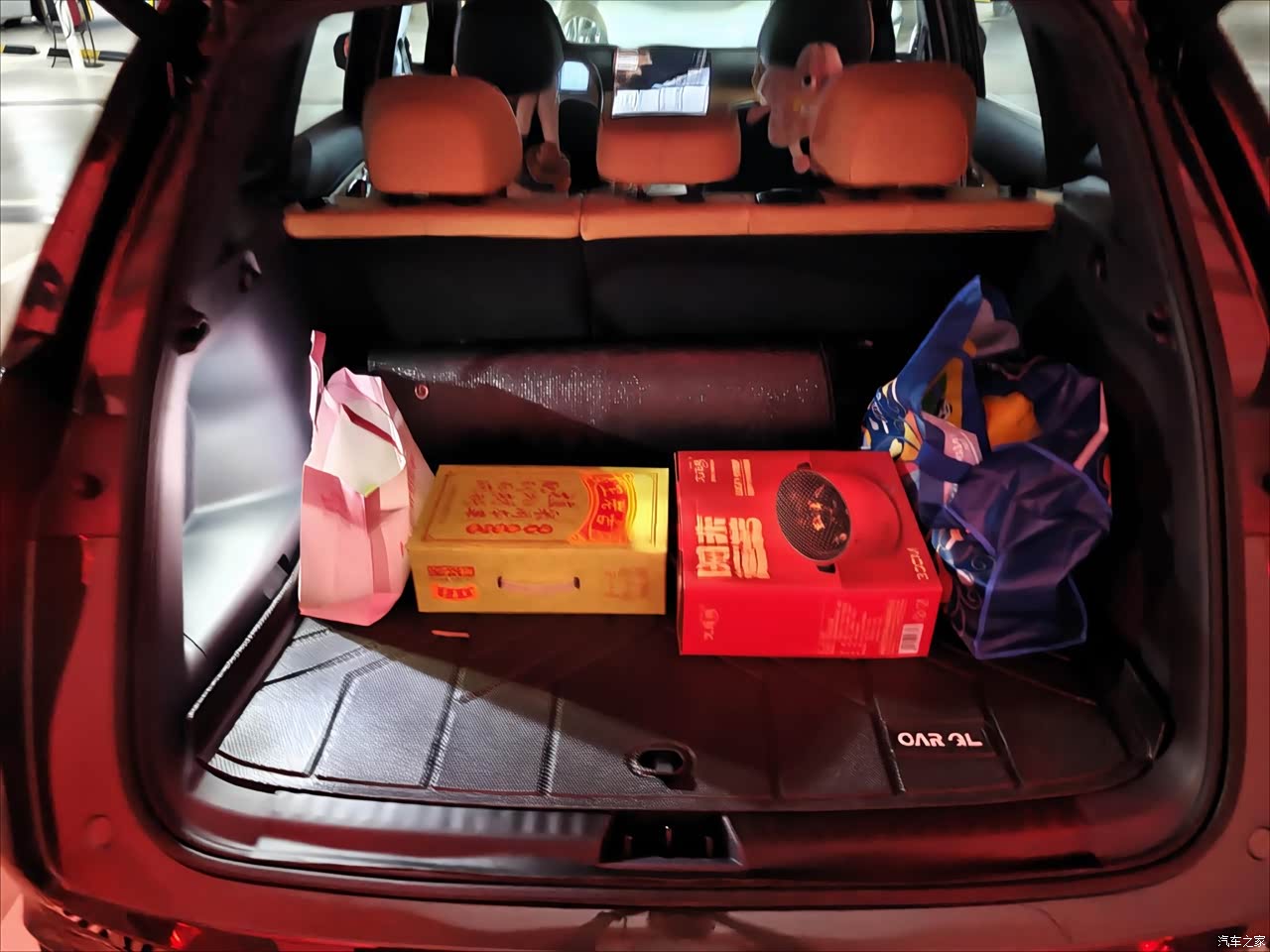 空间表现非常不错,个人1 m 8大胖子坐在后排可以轻松翘二趟腿,距离前排也有一掌距离,后备箱也可以放下3.2L东西,图中放了这么多东西在后备箱也只占了很少空间。