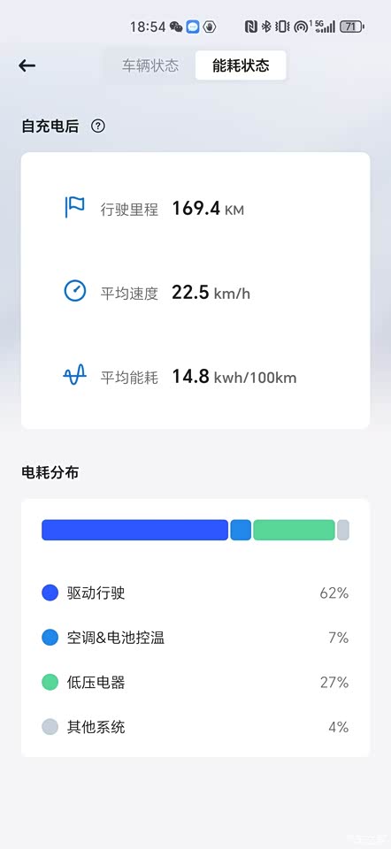 跑了一次高速,电耗约18-19,平时在市内大概14,基本上500km的续航是可以达成的。附一张最新的电耗,平时听歌比较多,低压电气耗电有点多。