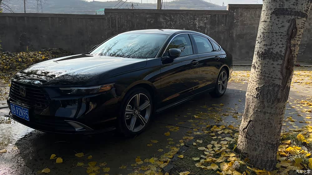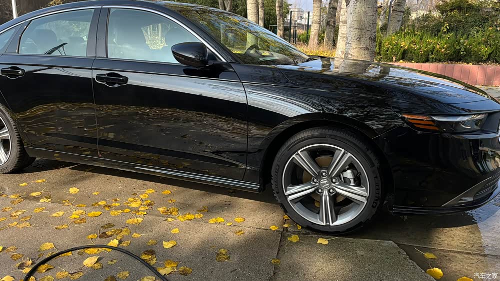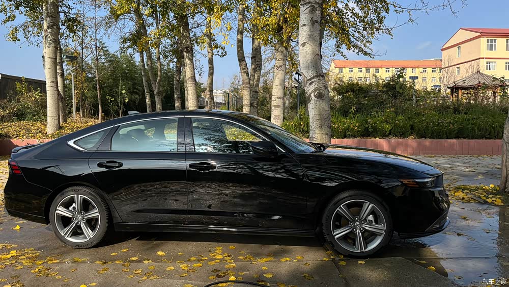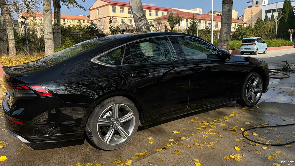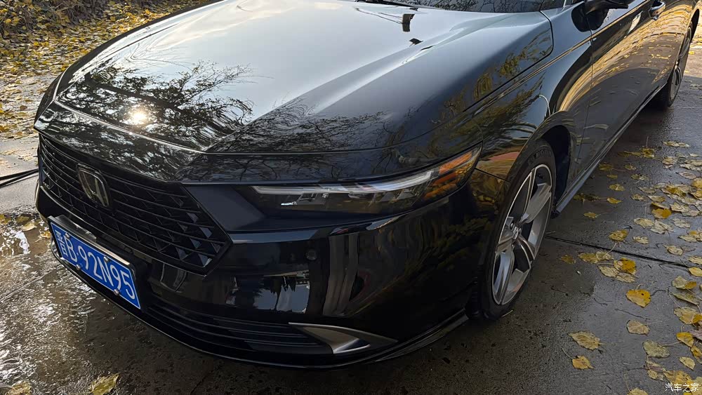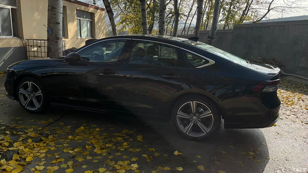 外观上可谓争议与质感并存我个人相当喜欢,这代雅阁前脸像“整容级换代”,用扁平化六边形熏黑中网替代了十代的镀铬大嘴。细长LED大灯带黄色反光片,配合主动闭合式进气格栅,实车看着比照片有质感。不过有车主吐槽像“帕萨特远房亲戚”,特别是白色车漆配黑塑料装饰略显廉价所以我买了黑色。运动版前杠带蜂窝状进气口和亮黑饰条,比普通版更带劲。 侧面线条:溜背+加长的双杀 接近5米的车长(4980mm)让侧面看着像“瘦身版A7”。溜背造型比十代更明显,搭配熏黑门把手和18寸轮毂运动感拉满。腰线从翼子板直插尾灯,洗车时发现这设计特显光影层次感。 尾部革新,经典回旋镖尾灯改用纤细贯穿式设计,夜间点亮像“发光腰带”。隐藏式排气略显低调,但后备箱盖的小鸭尾和底部扩散器扳回一城。 尺寸也进行了升级,长度比十代增加74mm,停车时明显感觉比隔壁迈腾长一截。2830mm轴距虽然没变,但后排跷二郎腿时膝盖离前座还能塞进拳头。