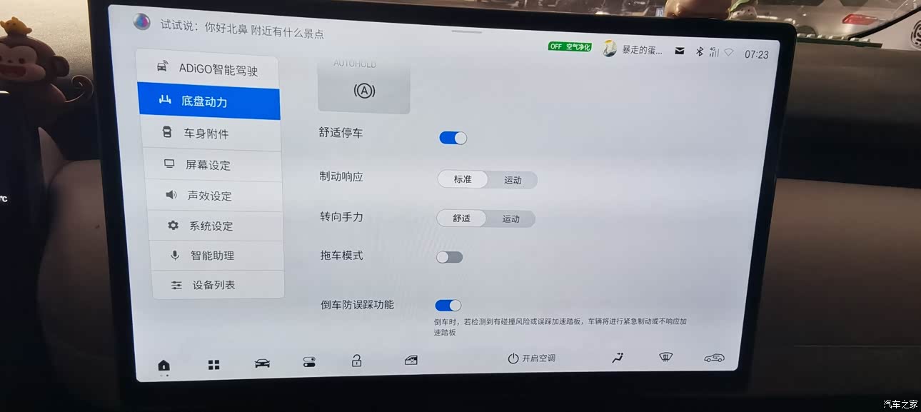 动力够用。底盘紧实平整。开起来也不错,方向盘反馈也比较精准。倒车有防误踩功能,这个刚开始不习惯,吓了一跳。还有能量回收,开启的弱的模式有一定的减速功能。整体不明显。
