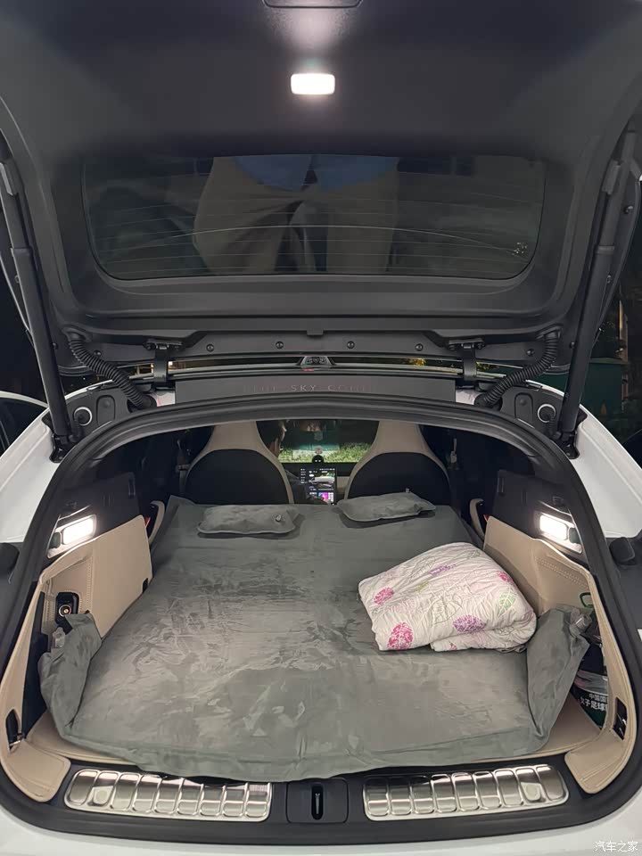 5t的车内空间确实不算很大,储物空间也不是很多,中控下方的空间虽然挺大的,不过实际使用起来并不是很方便(因为会被腿挡住…) 后备箱相对普通轿车肯定是大不少的,但是跟油车的旅行车相比还是要小一点儿。好在后排可以放倒,想铺个床垫露营两个人睡觉还是没啥问题的~