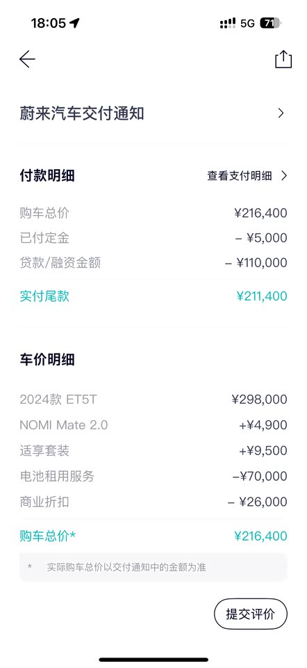 baas的情况下,开票价格是216400,算上置换补贴15000和地补6000,差不多是195000左右,连上保险,落地20万出头一点。我觉得这个价格能买到5t这样的外观、双电机、激光雷达、用料、内饰,还是挺有性价比的! 至于网上说的16万甚至更离谱的14万,完全是极少数极端的情况(免费换电权益等等乱七八糟加在一起)其实是不太现实的。 事实上蔚来销量不好确实还是价格太高了😂3-4月价格降下来清库存之后销量蹭蹭往上涨,说明在20万上下的价位,即使是老款的et5/5t/es6还是很有性价比和竞争力的。