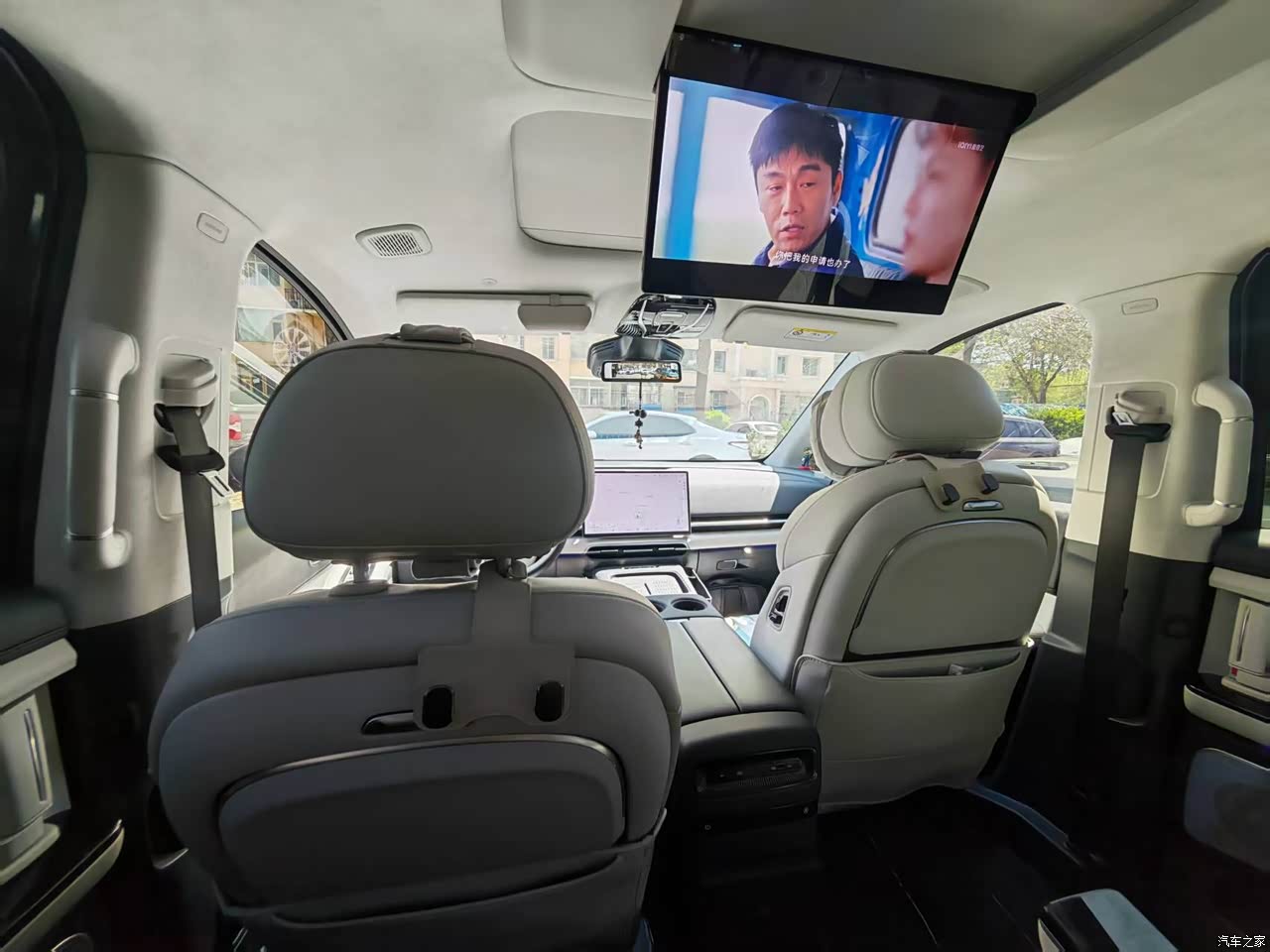 颜色我选择的是辉月青,后续以及贴了双色膜,很好看。 外观上,新梦想家前脸镀铬条设计,很有“劳范”,更偏商务风。后面则相对方正一些,尾灯也很漂亮。外观很豪华,内饰则与外观形成鲜明对比,内饰方面一块仪表屏加一块中控屏,加一块hud显示器,相对简约。出风口下面有一排实体按键,很方便。前排手机无线充电,储物箱,怀档设计,储物空间还不错。后排则是航空座椅,以及吸顶电视屏,配备了手机无线充电。内饰方面功能比较丰富。
