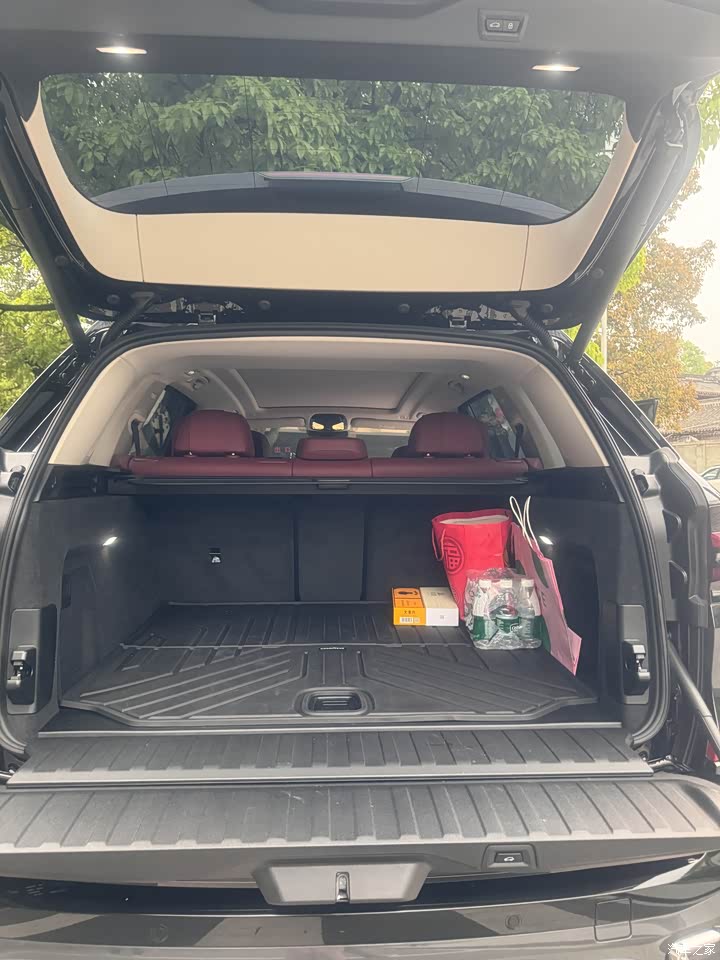 空间表现实测 前排:身高185cm驾驶者调整坐姿后,头部余量1拳半; 后排:加长13cm轴距带来奢侈的腿部空间(膝部余量超3拳),座椅支持前后移动与靠背角度调节,长途乘坐舒适性媲美行政级轿车; 储物能力:后备箱常规容积650L,4/2/4放倒后排后扩展至1860L,实测可容纳4个28寸行李箱+折叠婴儿车+露营装备