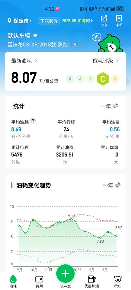 油耗感觉不是很满意,用小熊油耗记录,平均8.07个,加的都是便宜的油,平均一公里5毛多,市区里拥堵严重最高到过11个,高速上120巡航基本在7个上下,国道、快速路能够到5个,对于小排量发动机来说还希望再便宜点。