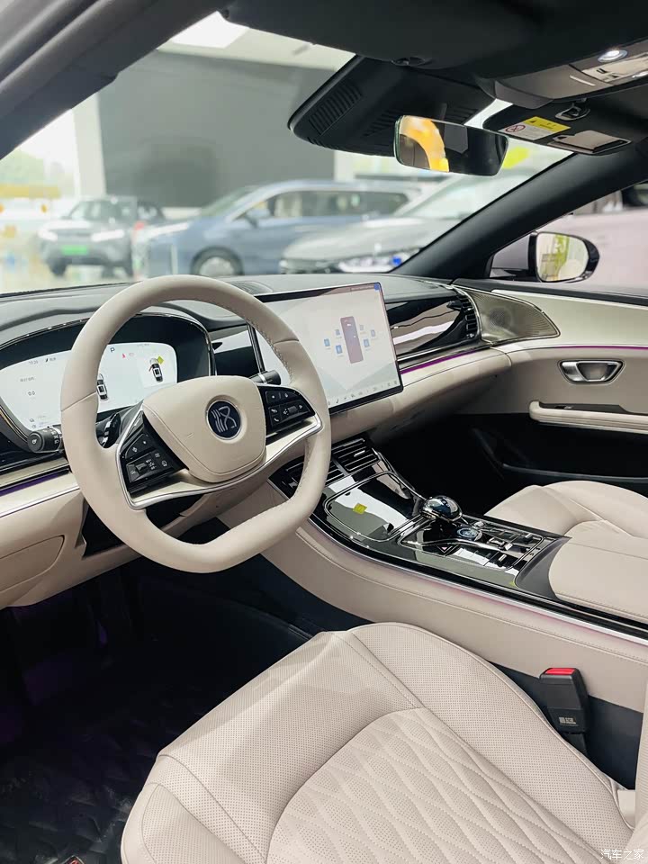 内饰的颜色搭配还是很好看的,我感觉还是有一种比较小清新的感觉,看起来也是清爽。然后在材质方面还有需要进步的空间,我感觉中控台不应该使用哪些硬材质,应该使用真皮包裹,才有豪车的质感。