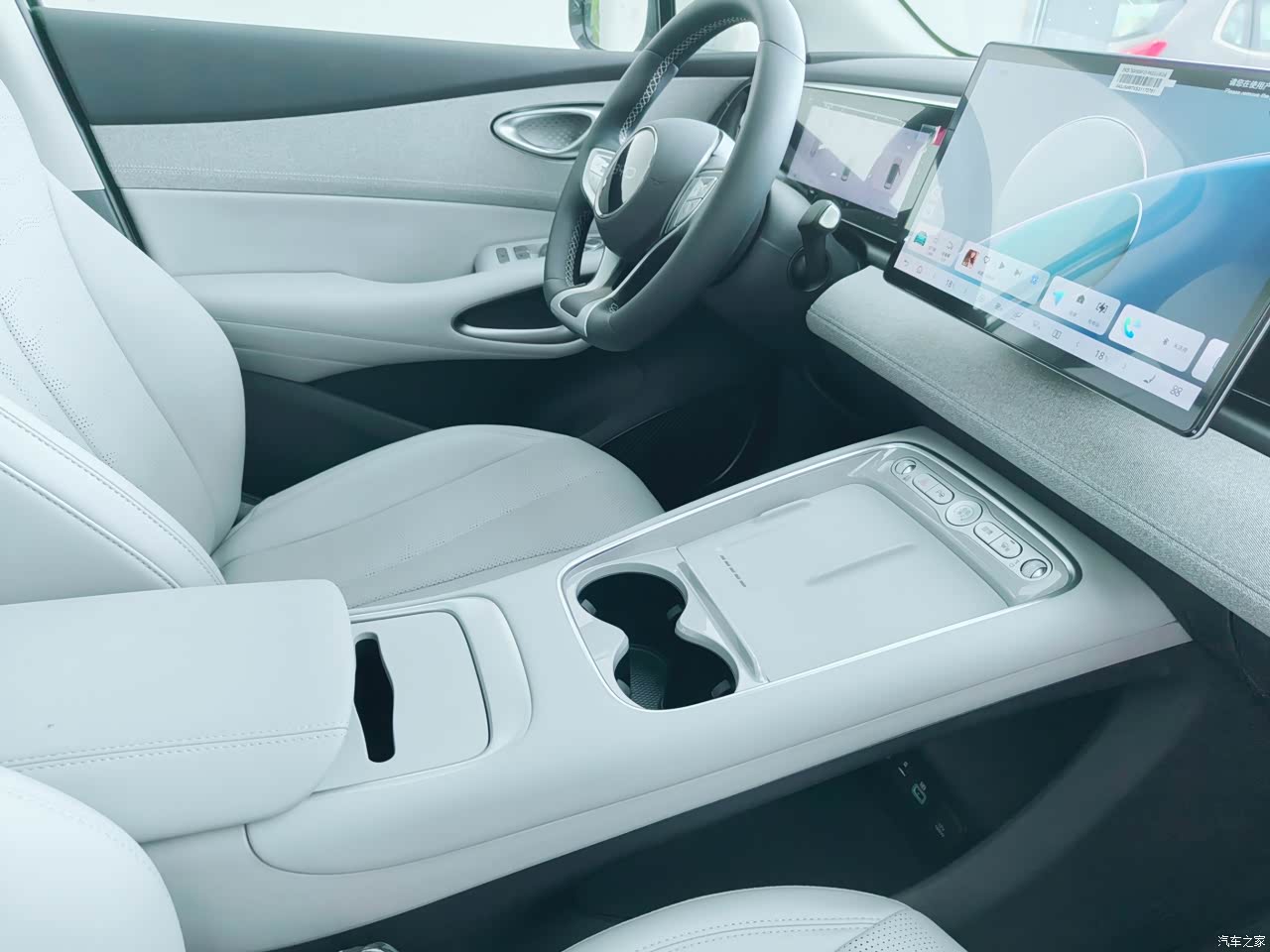 坐进车里,第一感觉就是温馨舒适。方向盘造型独特,握感也非常舒适,上面的多功能按键操作起来很方便,开车的时候手不用离开方向盘就能轻松控制各种功能。中控台采用了大量的软性材质包裹,触感细腻,细节处还加入了缝线工艺,看起来很有质感。悬浮中控屏显示清晰,操作流畅。