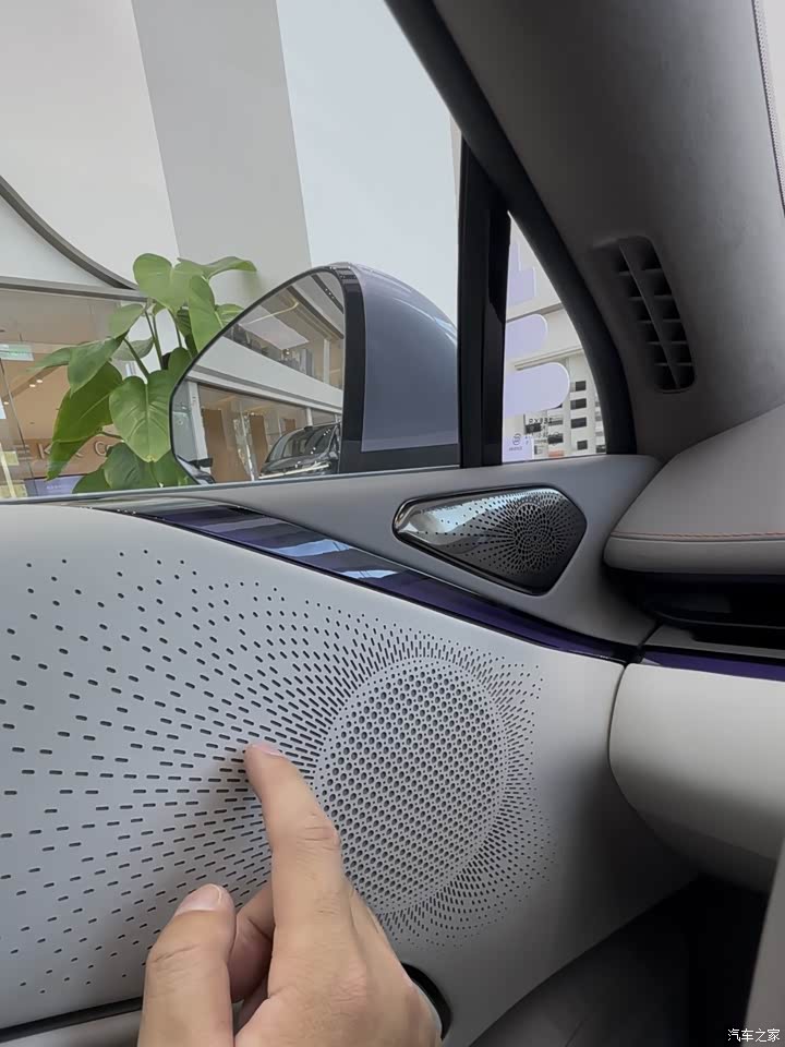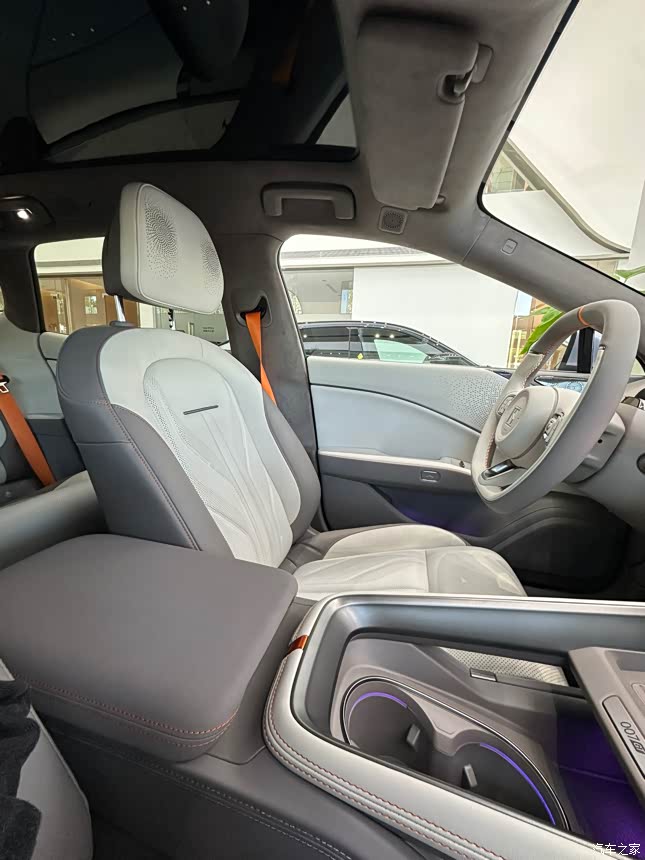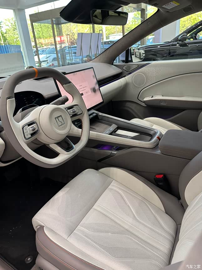 一坐上车内,内饰看起来非常高级,可以看出来在设计的时候花了很多小心思,尤其门板上的扬声器罩子,皮质包裹上直接打孔,而且是发散式的纹路,非常好看。车顶顶棚都是翻毛皮包覆,手感特别好,很细腻,中央杯架也是一深一浅的设计,而且还带氛围灯,氛围感拉满,个人非常喜欢 007GT 的这套内饰设计风格。