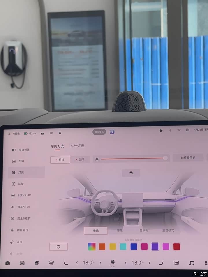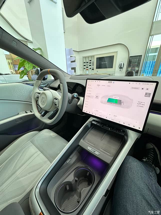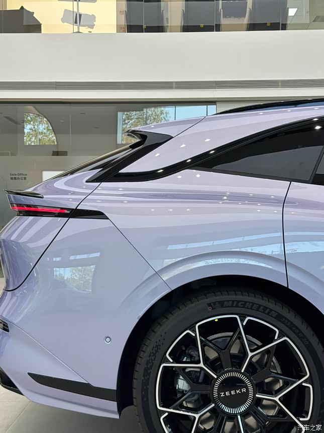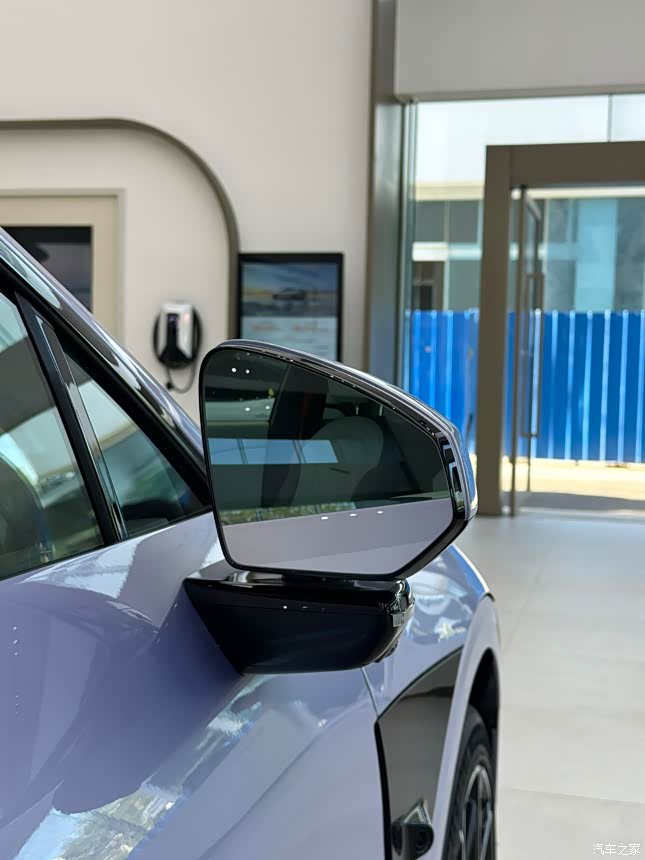 店里的展车是个紫色外观,低饱和度的紫色非常耐看,前脸外观很新颖,尤其是前面贯穿的日行灯组,非常有科技感,车身尺寸比例非常协调,尾部的设计层次丰富,尾翼的加持视觉效果拉满,非常的有运动范儿,20 寸的梅花样式大轮毂非常好看,还有无边框的外后视镜,简约精致,调节的时候还非常个性,是整个后视镜移动,很有意思。总结一下就是 007GT 的外观帅气,科技,动感,素雅,没有让人感觉外观设计有用力过猛的地方。