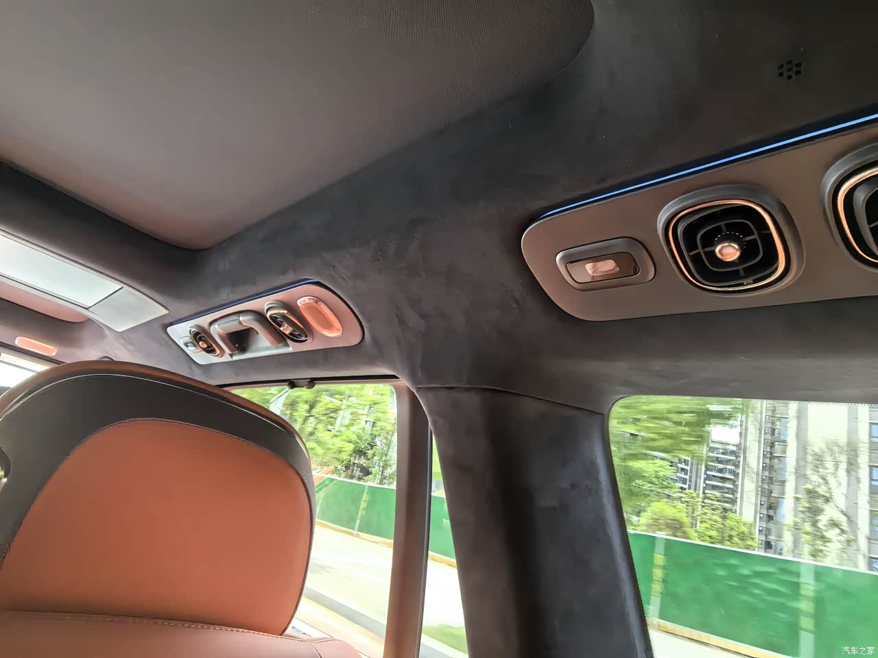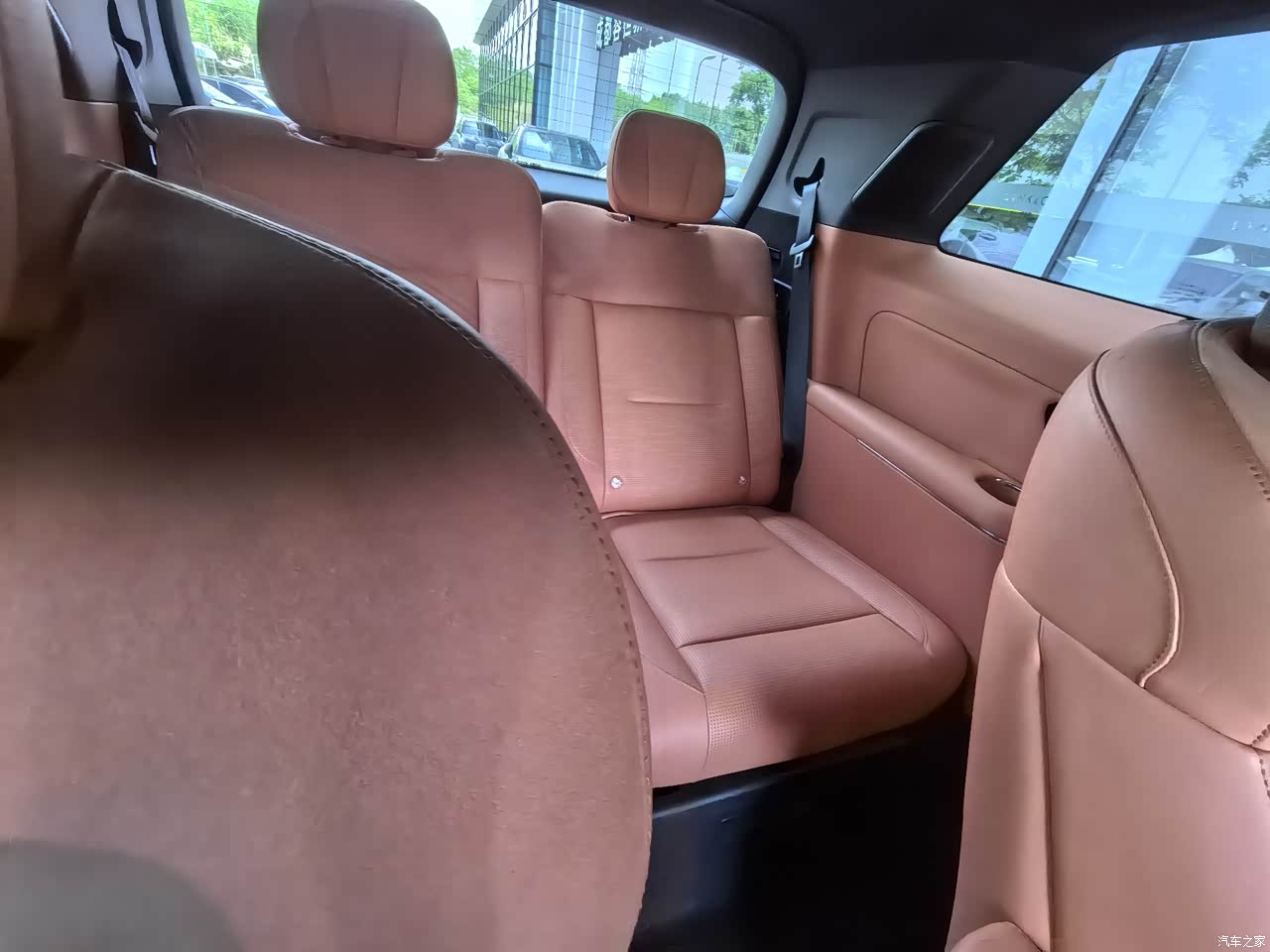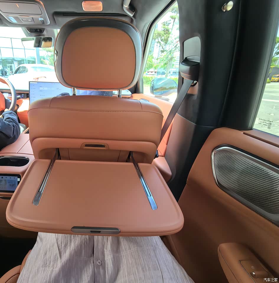 内饰颜色有三种,白色橘色还有黑色,我们看的展车是白色的内饰,试驾车是橘色的内饰,我个人更喜欢橘色的,显得更高级,简约而不简单,而且白色也不耐脏,尤其是有小孩的情况下。整体用料非常舒服,触之所及,软包手感都很好,都用的环保材料,车内一点异味都没有,这一点非常好评。内饰让人眼前一亮和惊喜的地方真的非常的多,车内总共有五块屏幕,前排双联屏,后排也是双联屏,超大,还能支持分屏,这一点我让我非常惊喜,整个就是把一个大电视搬进了车里,硬控小孩哥。扶手箱后边的小屏幕真的超赞,能控制的功能特别多,空调什么的就不说了,还能控制冰箱,遮阳帘等等,遮阳帘还能控制开合比例,轻轻一划就可以了,这样坐在后排陪娃的话有需要就很方便,也很实用。座椅舒服也很舒服,很软,长度刚好,支撑性很好。后排车窗还有个小遮阳帘,好评。还有两个小桌板,家用很友好。最强的是第三排都有通风和按摩的功能,这个真的是照顾到了每一个人的舒适和感受。