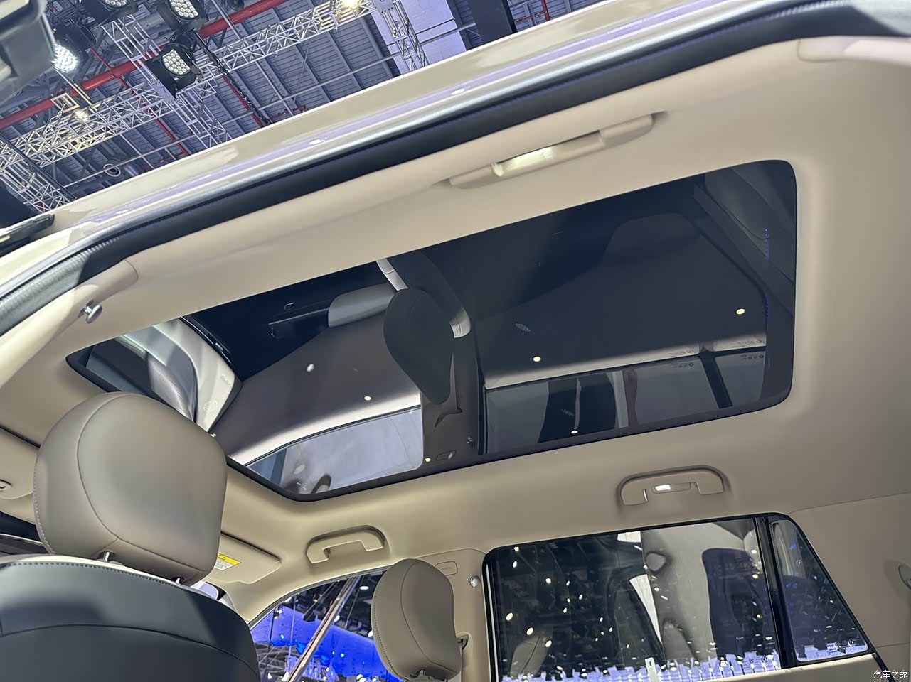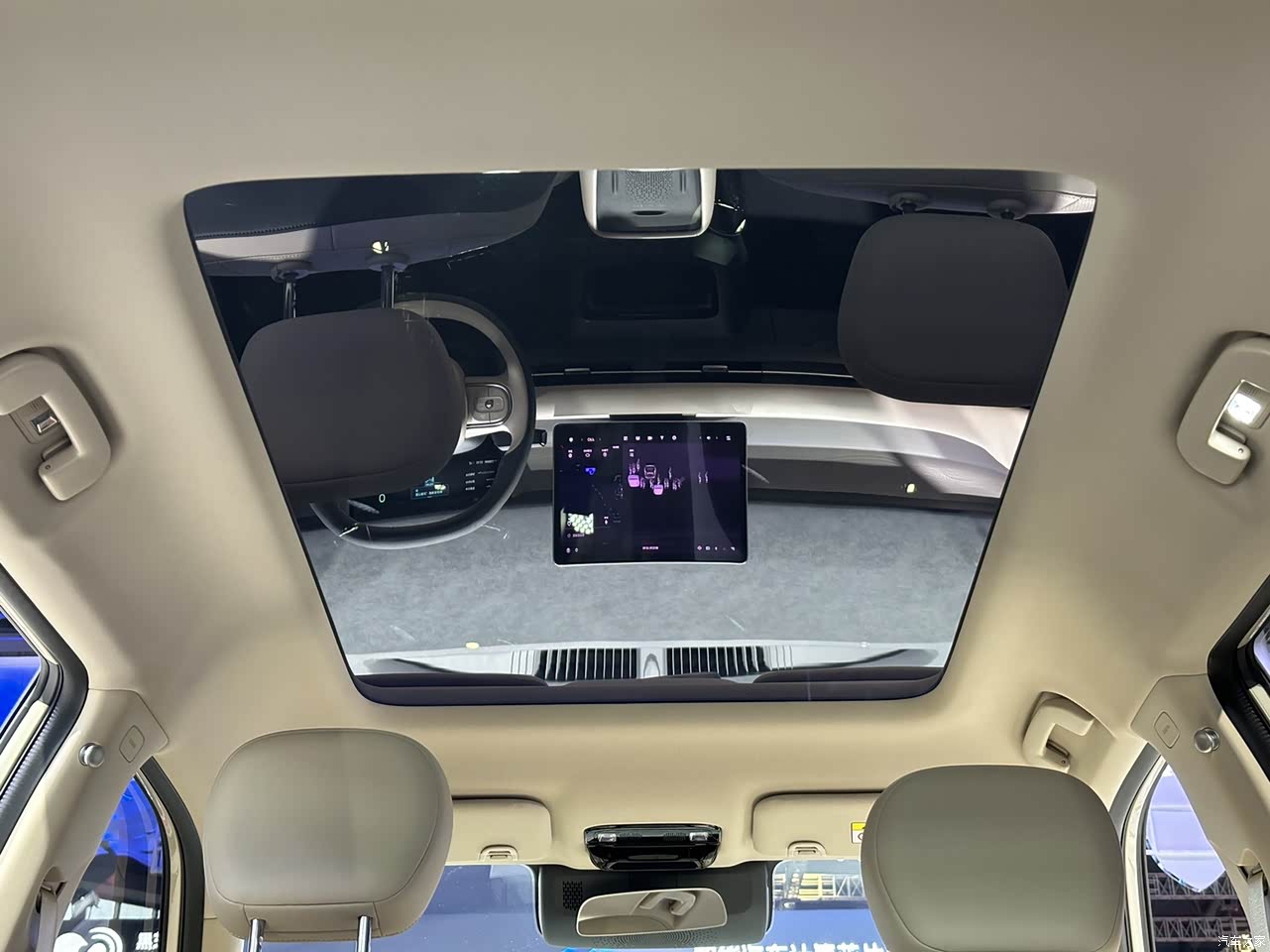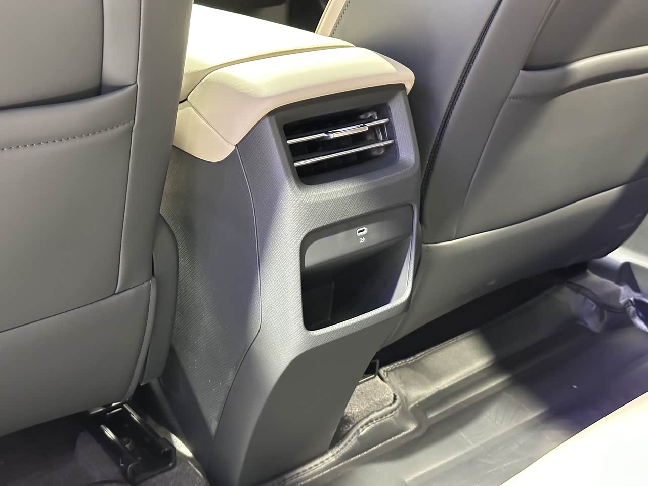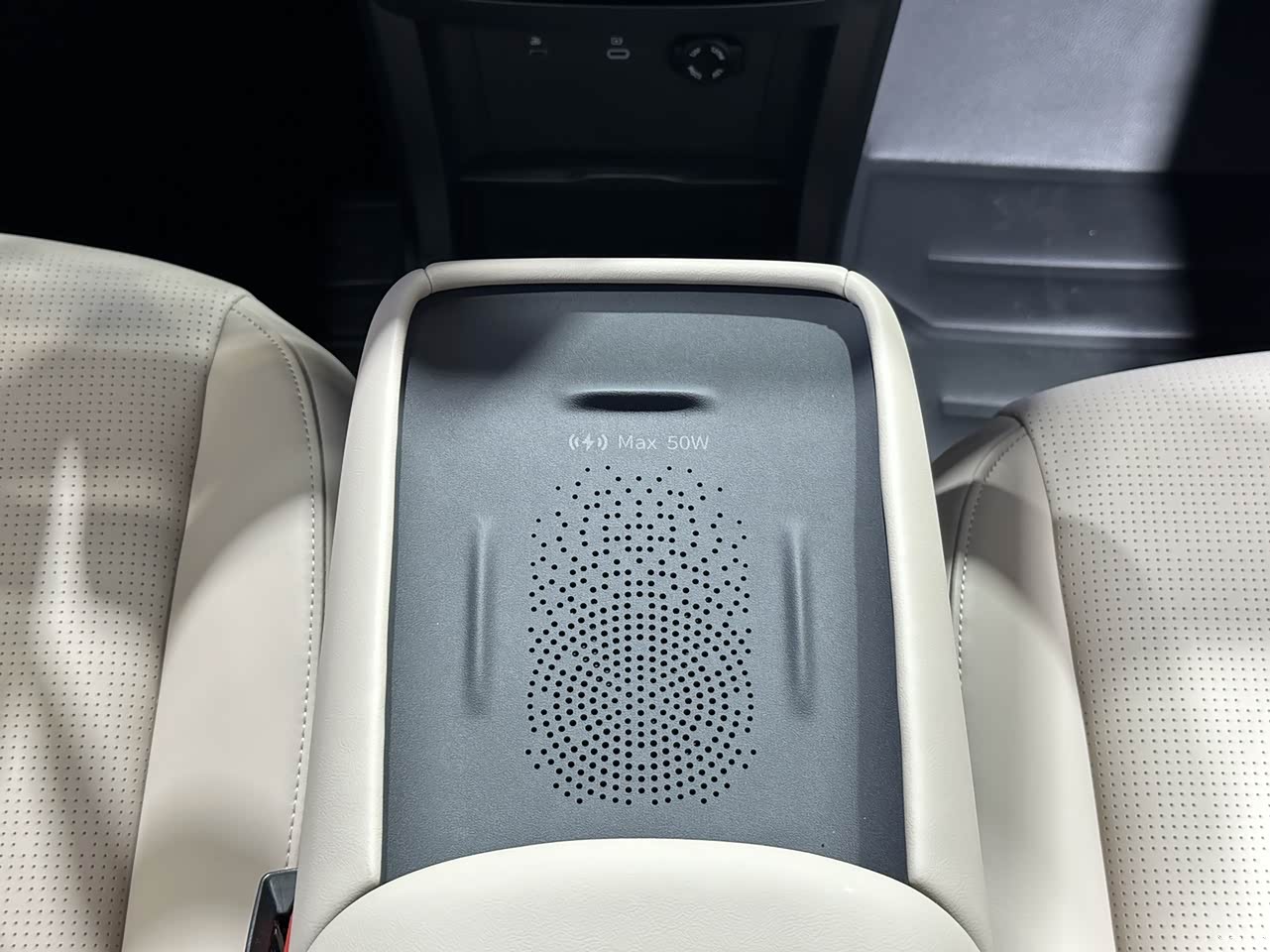 这台展车是一个拼色内饰,给到的感觉很温馨。仪表台的设计非常简洁时尚,全液晶仪表盘采用嵌入式设计,触控式中控屏采用悬浮式设计,营造的科技感很强。不过空调等常用功能缺少实体按键,高度依赖触控屏和语音,使用起来可能不是特别方便。方向盘采用拼色的双幅式设计,两端有多功能按键,实用性还是不错的。中央扶手箱前方是50W无线充电面板,底部采用镂空的设计,方便散热,手机充电还是很方便。 后排座椅中间有扶手和杯架,前方还有空调出风口、充电口和储物格,后排的乘坐舒适性还是很棒的。加上车顶的全景天幕,车内的采光和空间体验感非常棒。