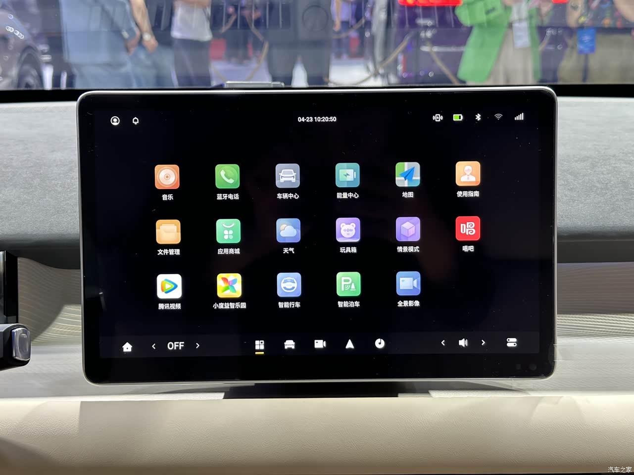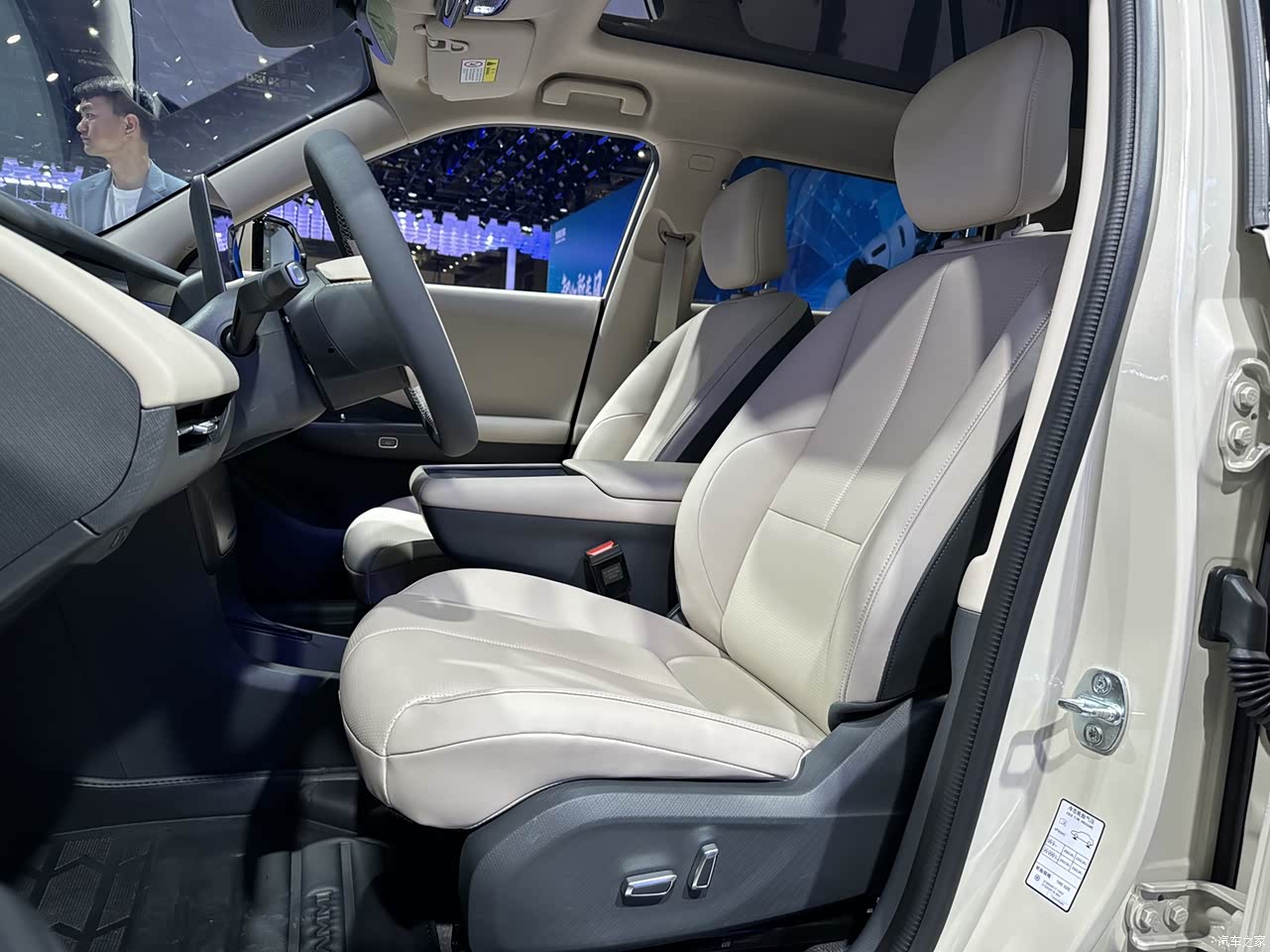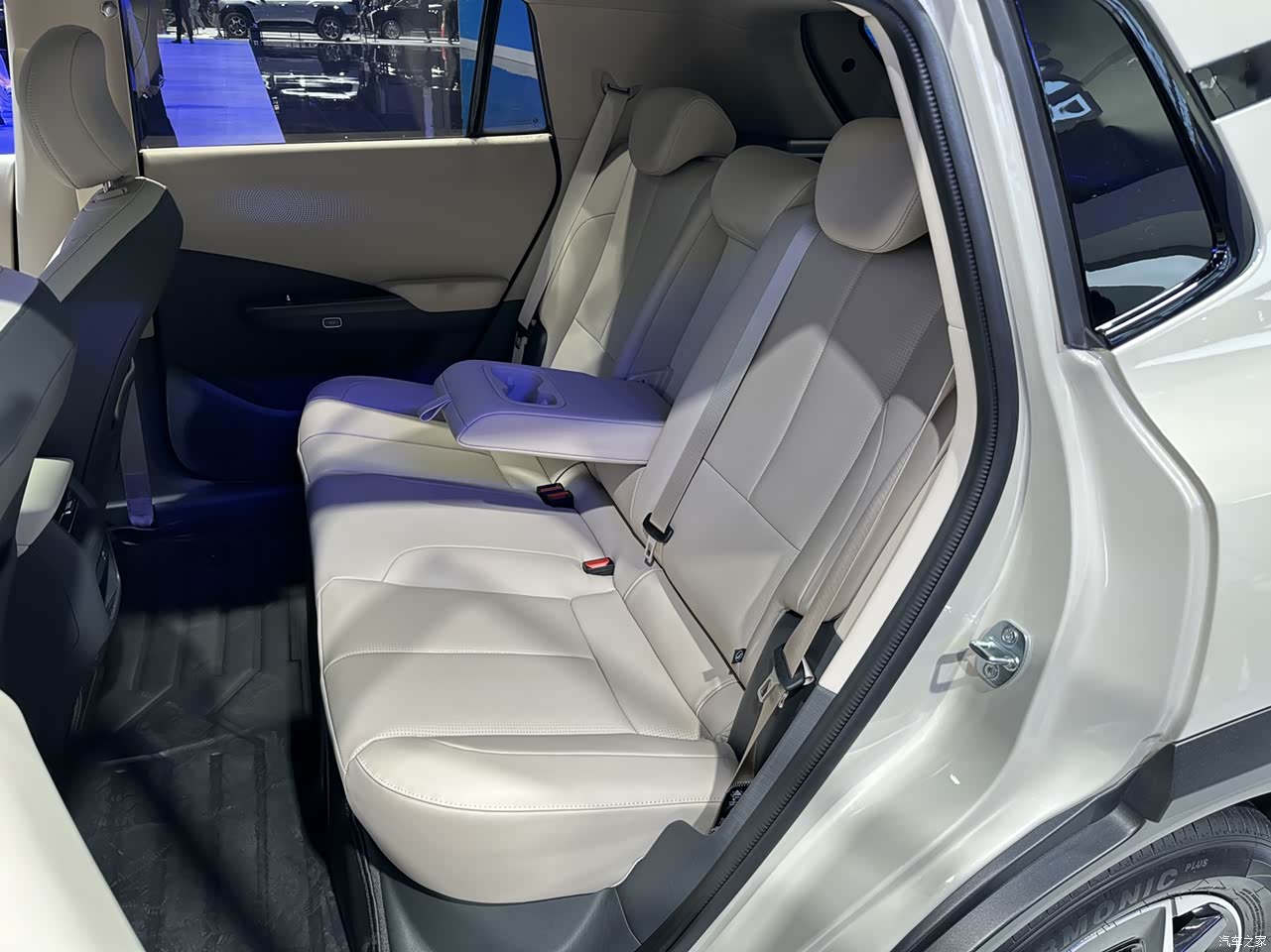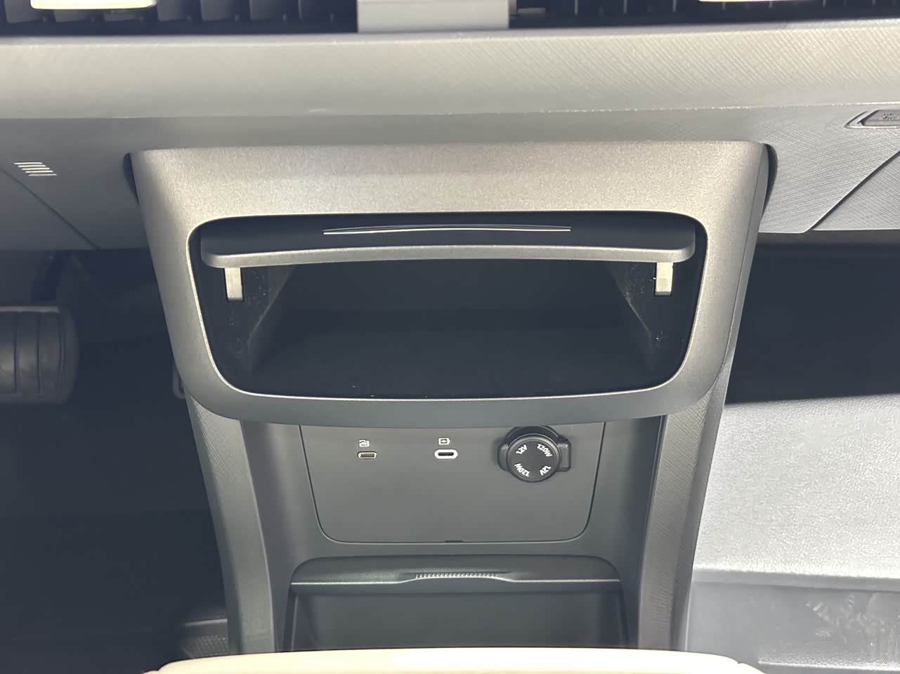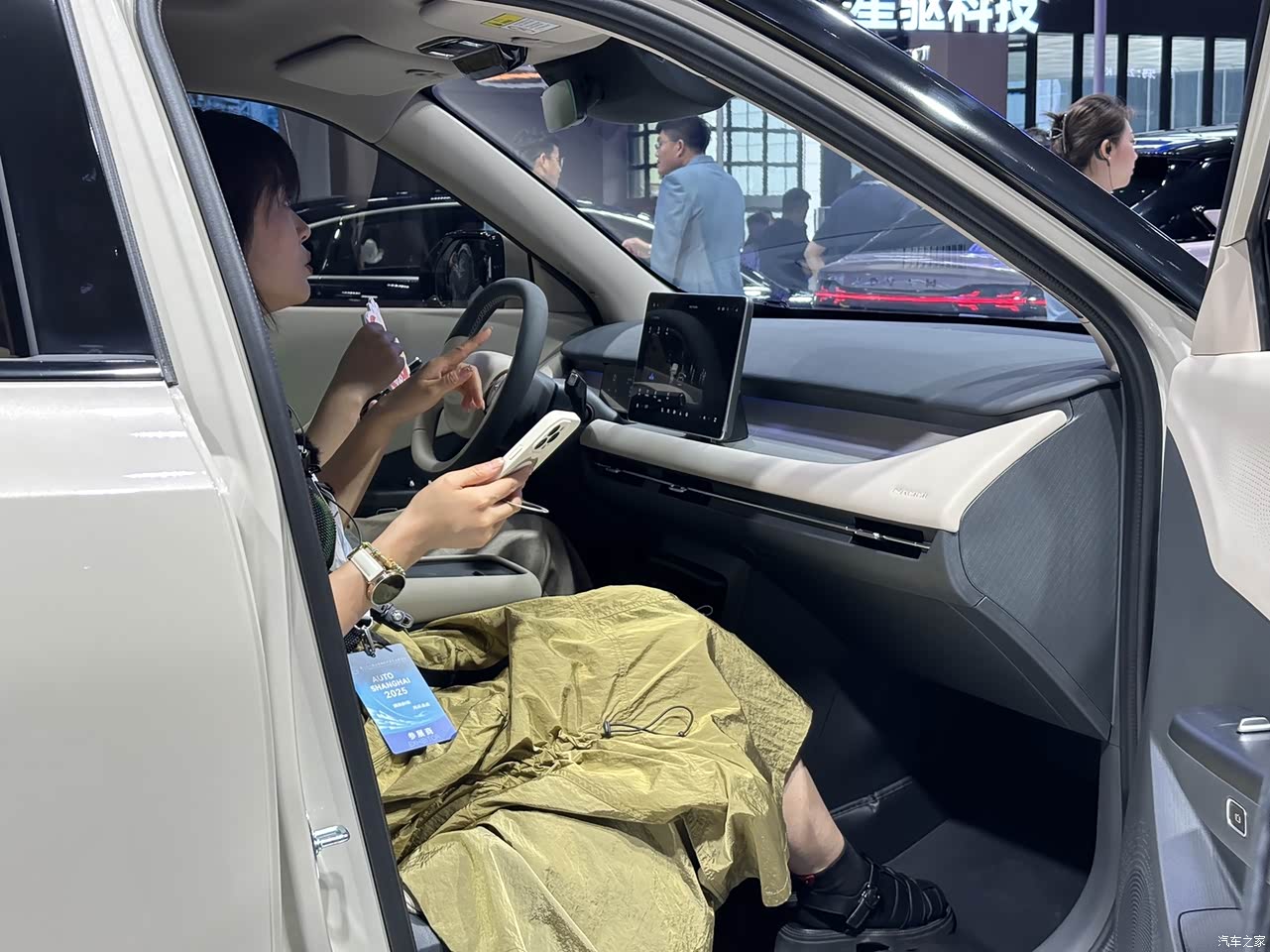 这台展车是一个拼色内饰,给到的感觉很温馨。仪表台的设计非常简洁时尚,全液晶仪表盘采用嵌入式设计,触控式中控屏采用悬浮式设计,营造的科技感很强。不过空调等常用功能缺少实体按键,高度依赖触控屏和语音,使用起来可能不是特别方便。方向盘采用拼色的双幅式设计,两端有多功能按键,实用性还是不错的。中央扶手箱前方是50W无线充电面板,底部采用镂空的设计,方便散热,手机充电还是很方便。 后排座椅中间有扶手和杯架,前方还有空调出风口、充电口和储物格,后排的乘坐舒适性还是很棒的。加上车顶的全景天幕,车内的采光和空间体验感非常棒。