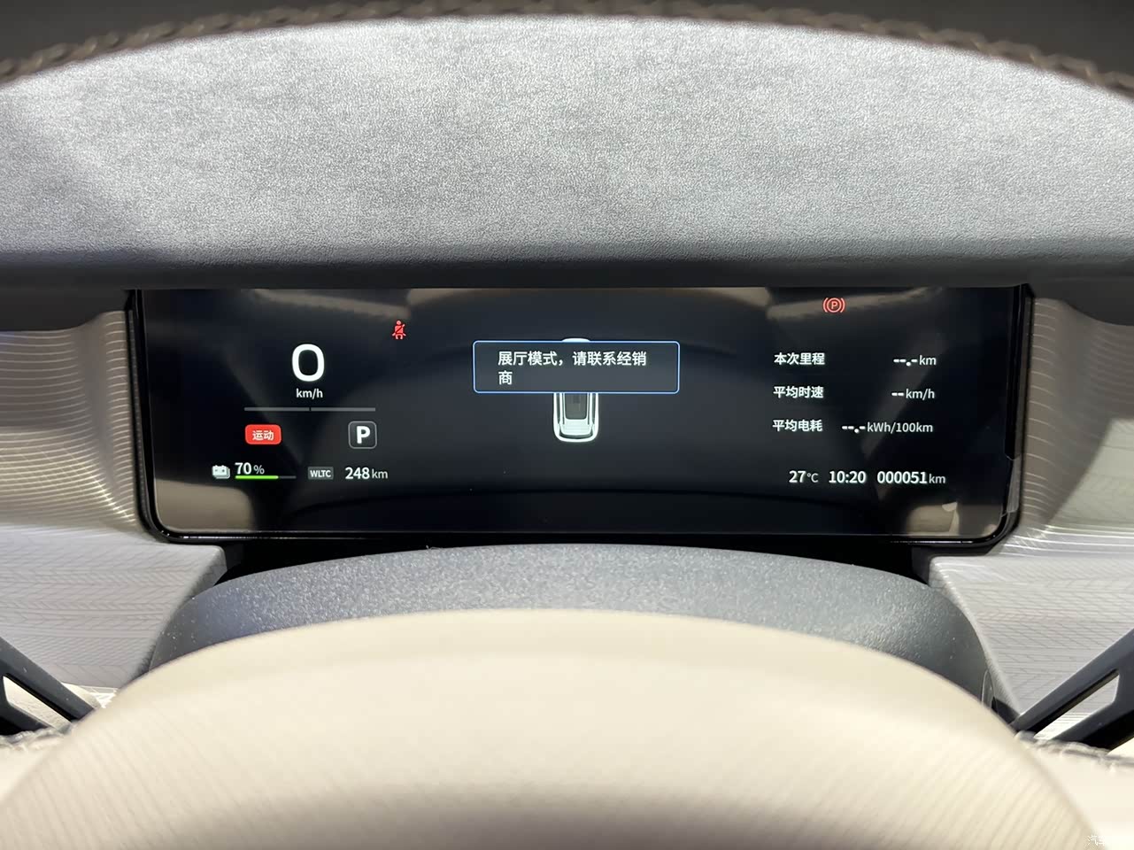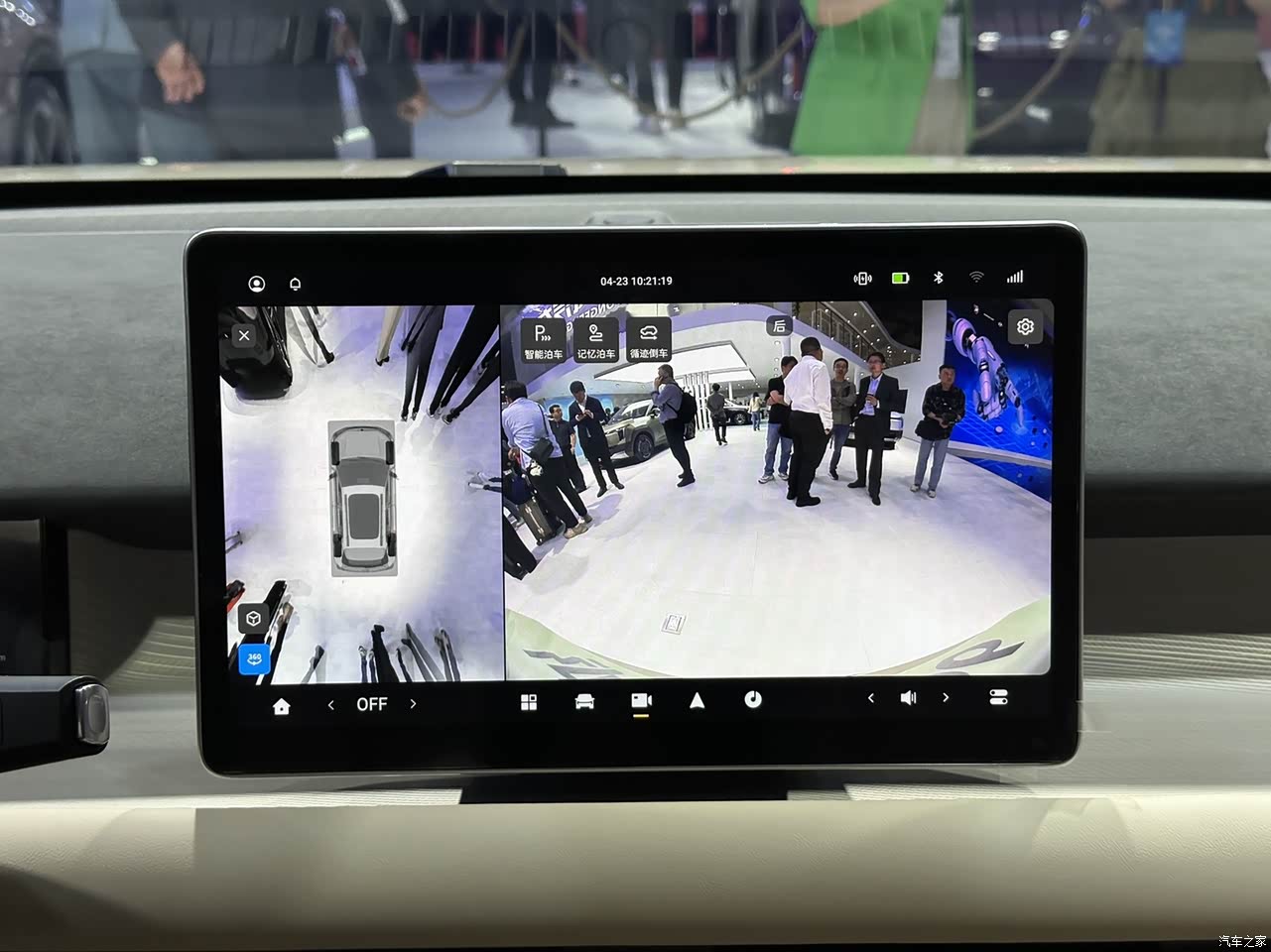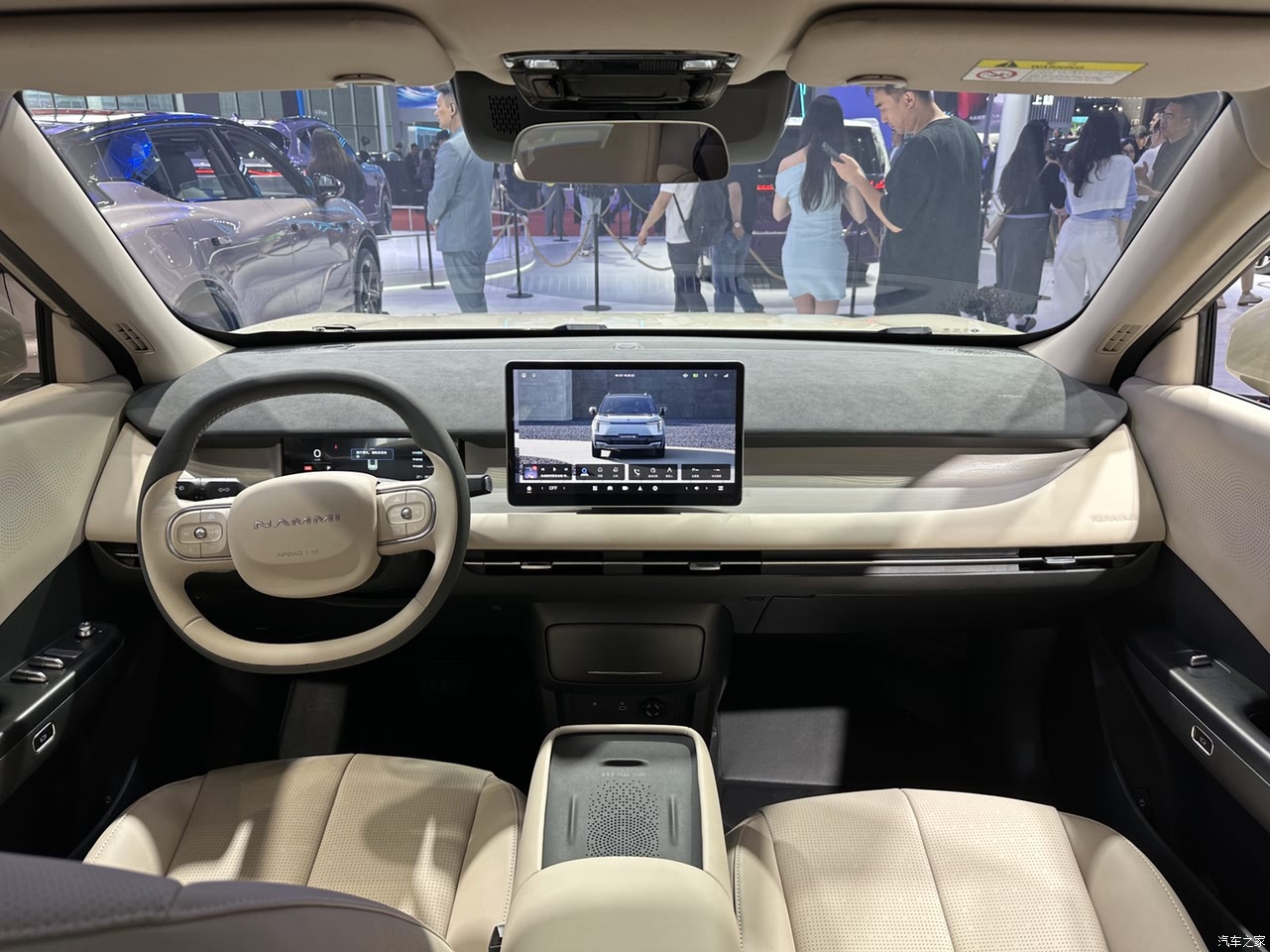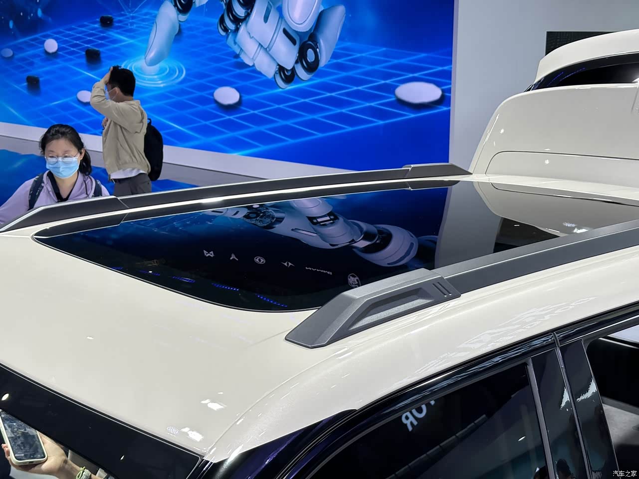 这台展车是一个拼色内饰,给到的感觉很温馨。仪表台的设计非常简洁时尚,全液晶仪表盘采用嵌入式设计,触控式中控屏采用悬浮式设计,营造的科技感很强。不过空调等常用功能缺少实体按键,高度依赖触控屏和语音,使用起来可能不是特别方便。方向盘采用拼色的双幅式设计,两端有多功能按键,实用性还是不错的。中央扶手箱前方是50W无线充电面板,底部采用镂空的设计,方便散热,手机充电还是很方便。 后排座椅中间有扶手和杯架,前方还有空调出风口、充电口和储物格,后排的乘坐舒适性还是很棒的。加上车顶的全景天幕,车内的采光和空间体验感非常棒。