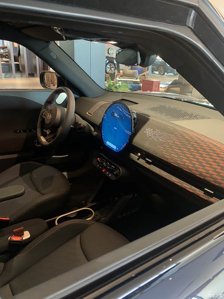 红黑拼色座椅、赛车旗元素中控台、圆形OLED触控屏,支持语音控制与个性化设置。