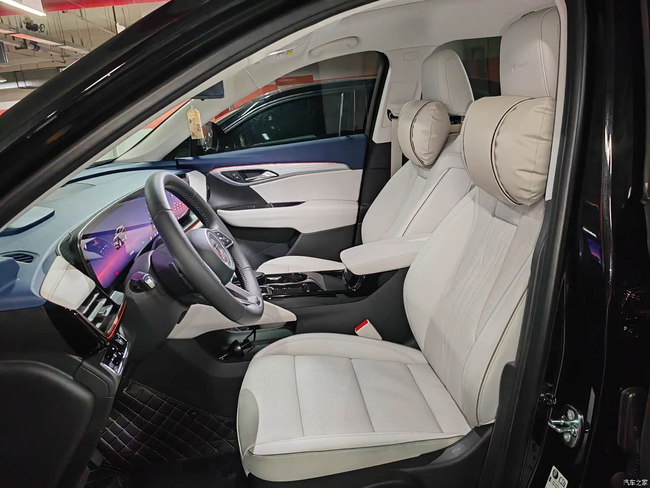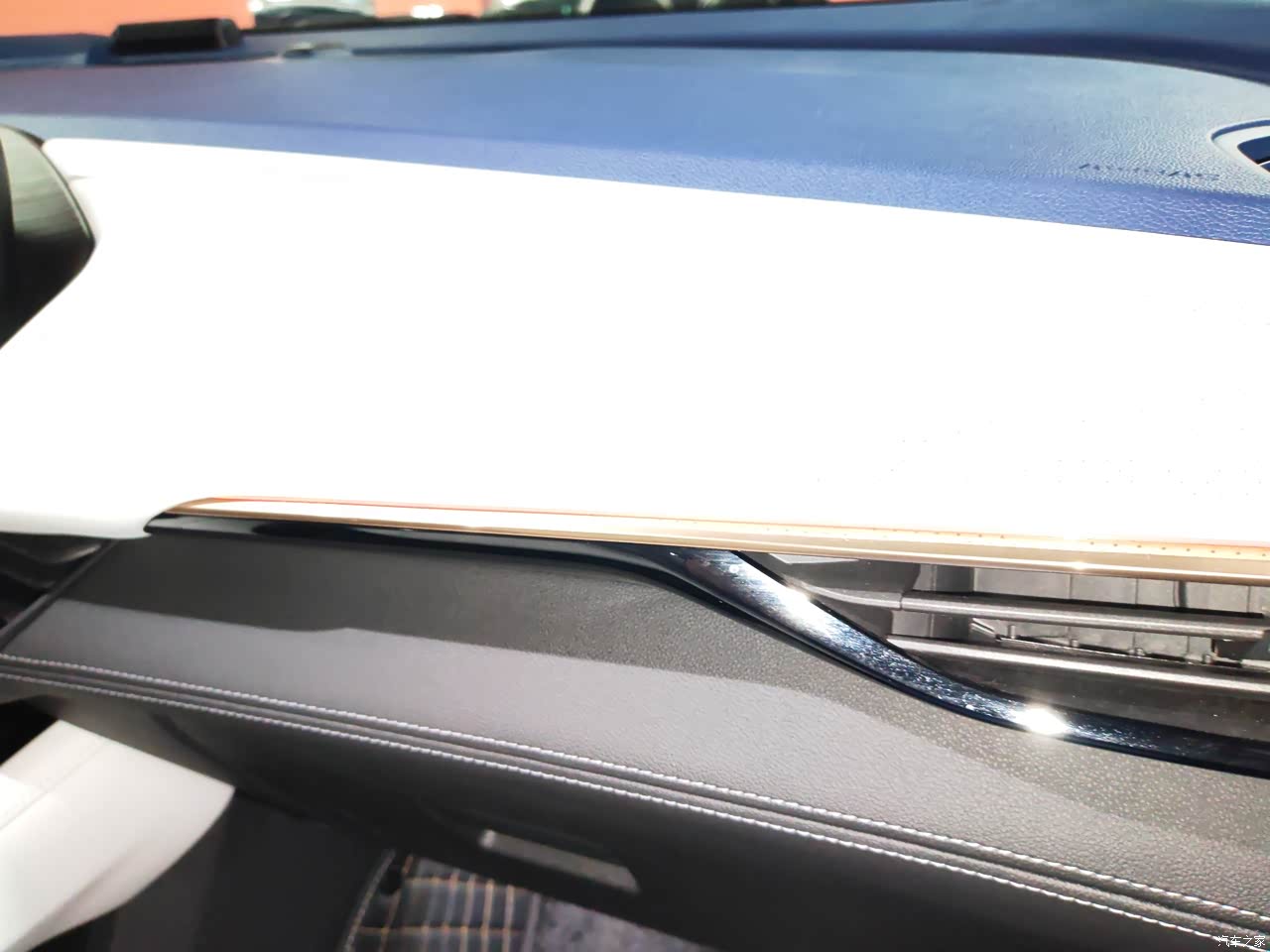 艾维亚版的蓝白内饰非常耐看,清新优雅。有人说不耐脏,我开始也有些顾虑,但是车子尤如居所,要靠人爱惜与打理。我用碧丽珠将座椅,内饰等处理一下(方向盘不能打蜡,切记),这样就不易弄脏,也变得好清洁了。自己花钱配了4只真皮头枕,与内饰很搭。 真皮座椅及大面积的软包材质,机缝线及金属拉丝门内饰使得车子档次提升不少,氛围灯色彩多样化,满是个性需求,只可惜没有后排氛围灯,这个有点不应该,不知厂家怎么想的????