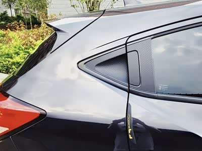 本田缤智的门把手设计可以算是现在新能源汽车隐藏式门把手的祖师爷了,本田缤智后门的门把手是与车身一体的,没有凸出来,在车后窗角位置。如果是轿车的话,这里一般C柱有个三角窗,缤智就把这个位置设计成了一个门把手,第一次要坐后座的人通常找半天都找不到怎么开门。这样设计也有好处,就是整体更具有运动感,美观度也提高,整体性更佳,就像一个两门的轿跑SUV一样。 这个门把手我为了有点儿新意,也是考虑到美观的设计,在网上买了碳纤维纹路的贴片,原本黑色的门把手贴上碳纤维的纹路,瞬间显得高大上高级了很多。一点小小的点缀就可以提升车辆的质感。