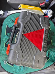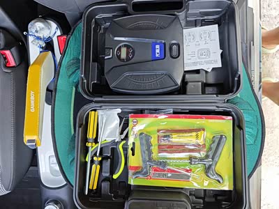 这个小宝箱平时就放在我本田缤智的后备箱,里面主要就是一个电动打气泵,还有1套补胎的工具。外箱这个反光的三角标志也可以当应急的三角支架使用车辆抛锚或者出现故障,停在路上直接把箱子放到车后面,也可以充当三脚架还是挺醒目的打开箱子里面就是这些东西,最主要的其实就是充气泵,轮胎没有气的时候,把充气泵的电源插入电源口,然后开启充气泵,很快就可以把轮胎气打满。充气泵设计的小巧便捷,做工也确实不错。还带显示屏能够显示实时的胎压,这个工具算是随车携带很实用的东西了,也是长途出行的保障行车的好搭子!