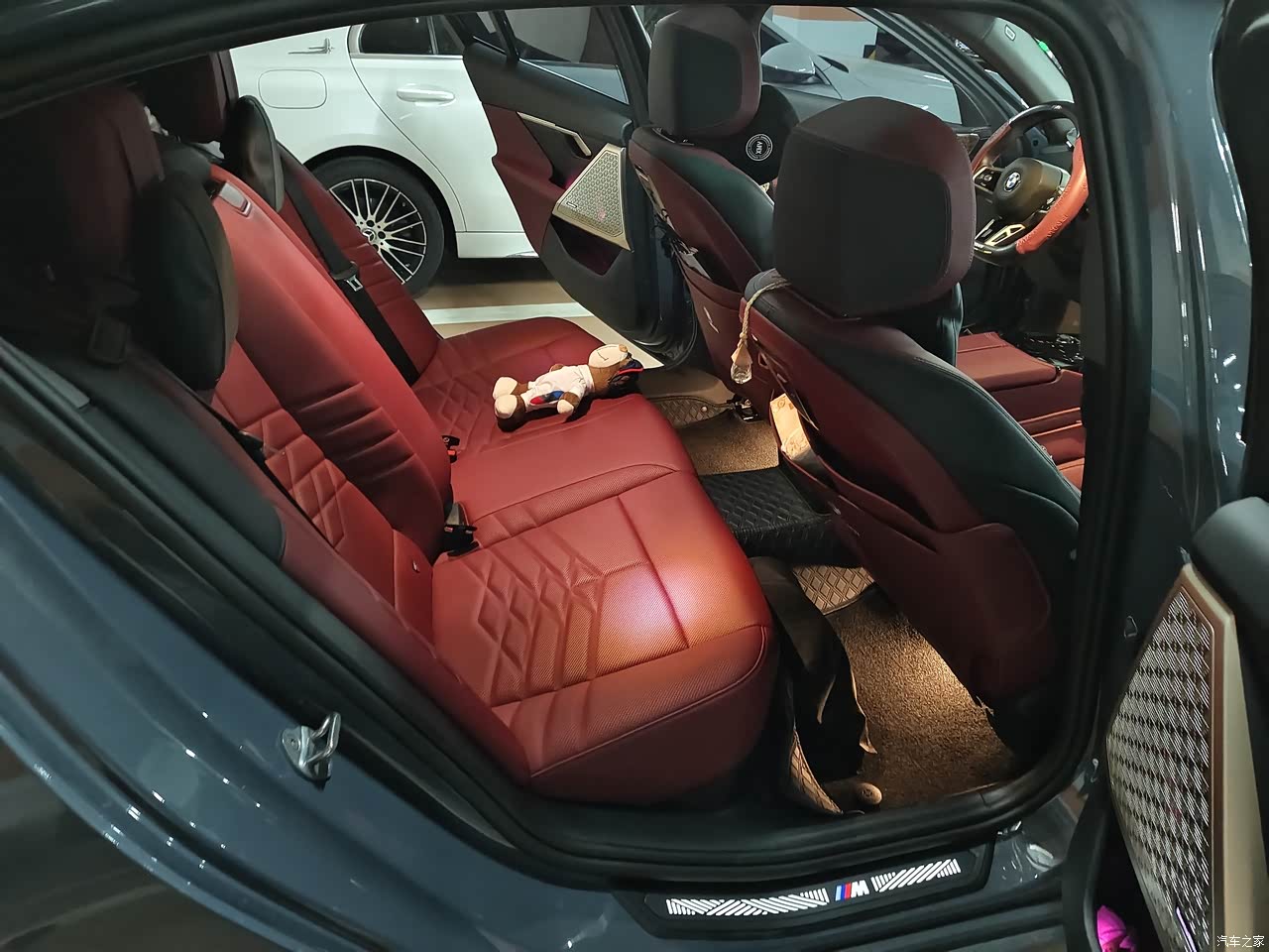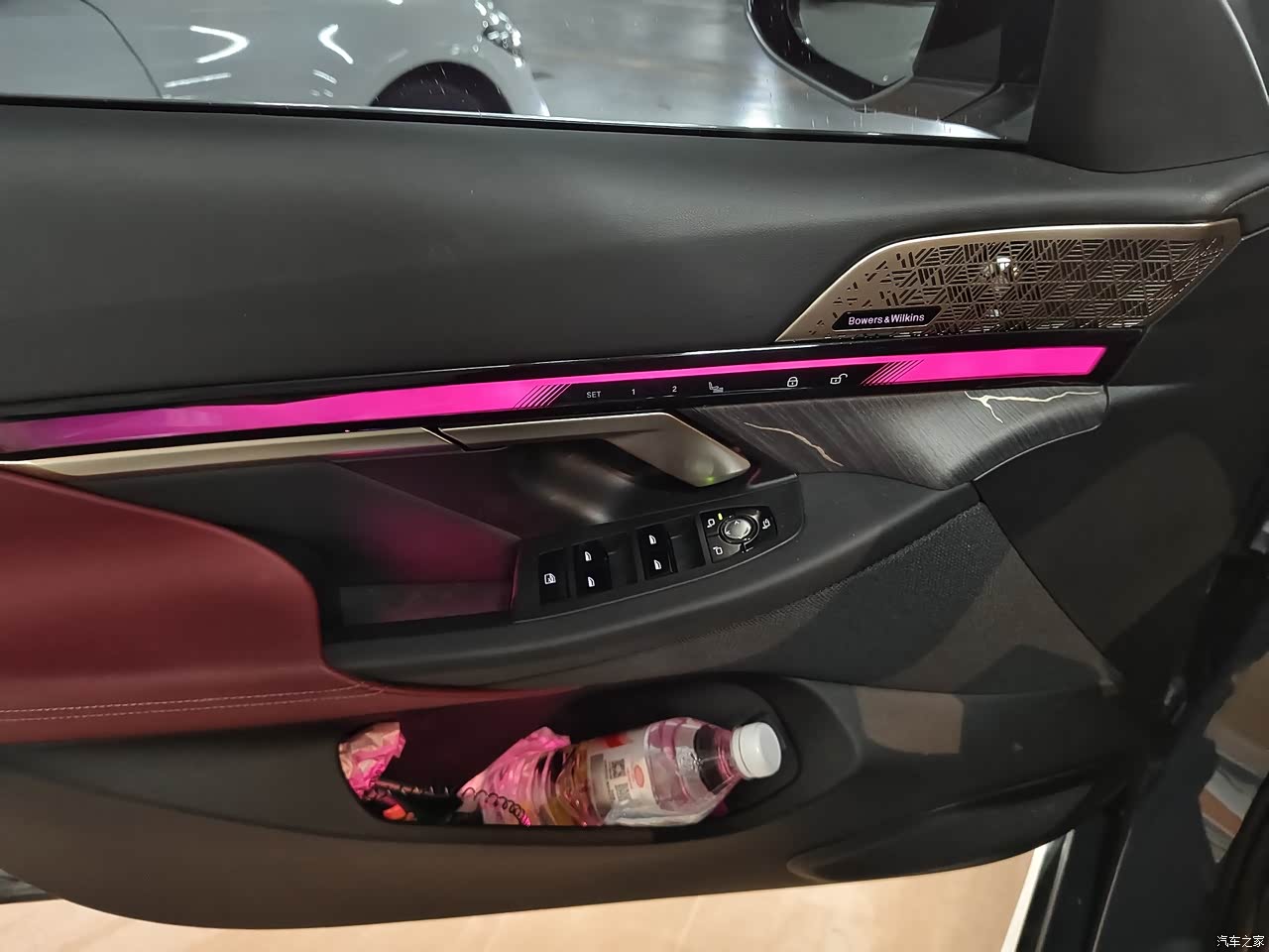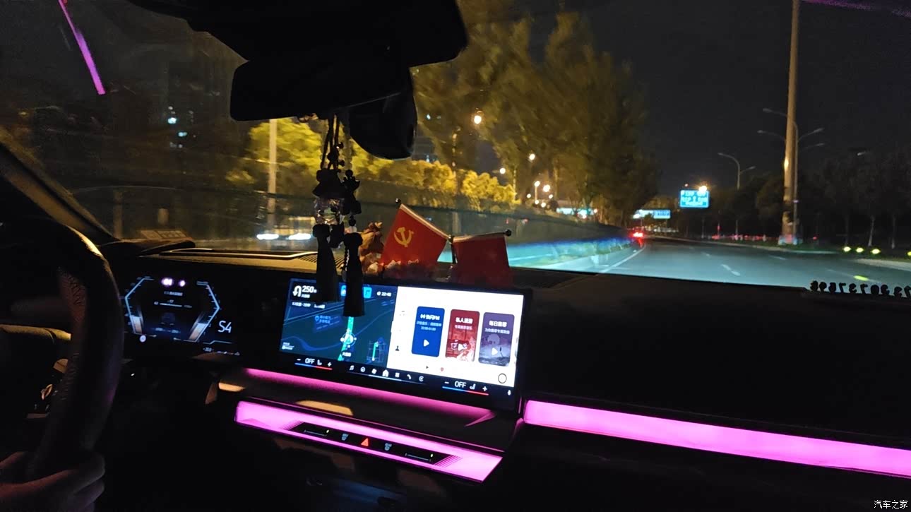 内饰是红黑双拼,确实蛮大气的,也很整洁,然后,阿里明星确实很不错,会让人感觉上车就像是电车一样,自带的氛围灯也很棒,颜色可以自行选择