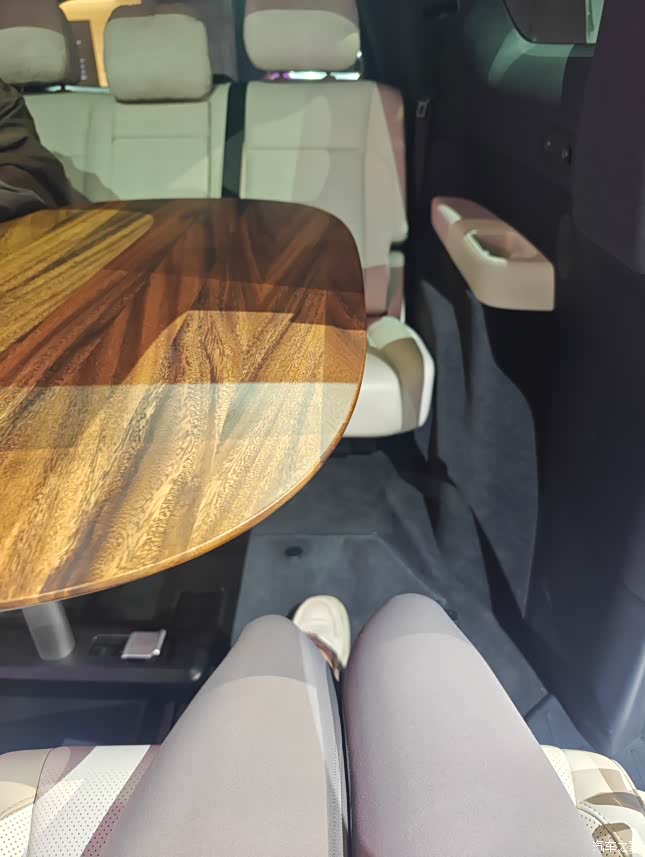 二排的两把旋转零重力座椅同时支持无级电动旋转和零重力功能 让移动的家延伸出无限可能 不论是180°对坐还是45°便捷上下车都能轻松拿捏 而且对坐大客厅模式下的上下车也无需担心 亲自体验过后发现它比很多MPV的第三排上下车空间都要更宽敞 最开始我还担心对坐模式下满座4人+一张桌子后的腿部空间 如此一看完全无须担心,相当充裕 甚至2个人的时候开启零重力模式妥妥的秒变大床房 虽然定位家用车,但设计师绝对偷偷修炼过空间折叠术! 而且这张悬浮小木桌也不简单哦 可以随意转动调整自己喜欢的位置 拆装过程极为简单,还可以无缝放置在后备厢的下沉空间内