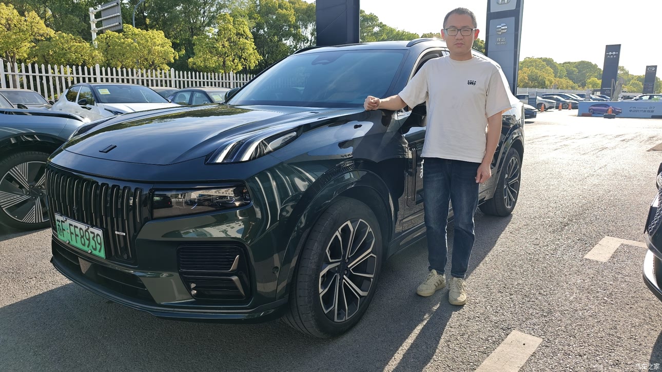 上周六阳光正好,微风不燥,上上周末去男同领克(南通赛路丰众沃)4s店试驾领克09被告知没有现车,需要去另一个店借车才能试驾,后来提前和小哥预约了试驾时间,小哥提前10分钟到小区门口,服务热情周到,值得点赞。由于本人家庭人数增多,原本的两厢福克斯难以满足家庭出行需要,考虑到空间,乘坐舒舒服,安全配置和长途出行的需要,家里有充电桩,而且有长途400公里出行的需求,所以便考虑了领克09混动版,看到实车后给我第一感觉就是很大很有安全感,前脸大嘴霸气外露,车身尺寸为5042*1977*1780,车身修长确不显笨拙和臃肿,说明领克得设计师还是🈶有一定的设计功力的。 车屁股的能量晶体尾灯很有辨识度; 半隐藏是门把手好评; 五米多的车长配上20寸的大脚,正所谓好马配好鞍,轮毂得样式像花瓣,稳重中带有一丝优雅。 前脸的分体式大灯继承了领克的家族设计语言。