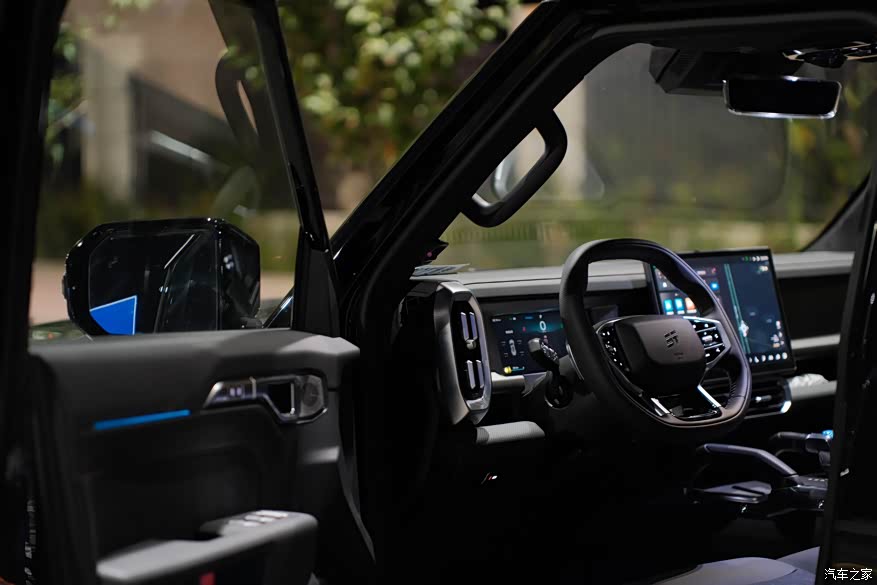 水晶档把,超大屏幕,中控台软质材料包裹,多色氛围灯,还有中间扶手,一上车就有些硬派越野感觉,黑色内饰还是比较酷的!