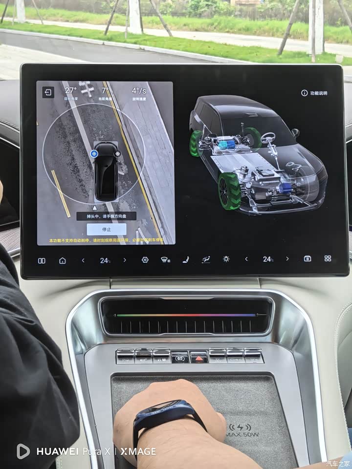 腾势n9配备了比亚迪集团研发的易三方平台技术以及云辇-a空气悬架底盘控制技术,以及与天神之眼b融合的道路预喵技术。可谓是黑科技拉满。实际体验下,底盘表现紧实不松散。过起伏坑洼路面无异响。同时也能过滤绝大部分坑洼不平的路感。我试驾时还没开通道路预喵功能,但是在我的n7上,预喵功能已经很完善了,的确能够提前预判道路的坑洼起伏不平,做出悬架的软和硬的动作去抵消路面差异对车身姿态的影响。主观体验就是忽忽悠悠地就过去了(不是悬架拉不住的那种开船感,更像是悬浮感),感觉特别神奇。 车载大屏配备的“云辇”app不仅可以对车辆高度进行手动调节,也能对底盘软硬进行主观调节。在过一些需要抬高底盘的路面时,还可以锁定底盘高度让驾驶员能够放心行驶。 我也试了易三方泊车。在一个适合停车的路边车位,车子只需要右前轮扎进车位,启动易三方泊车,尾巴向内横移即可完成停车。我在车里的感受就是太神奇了,这种“违反”驾驶思维的行为真的太独特,太有意思了,下一台车必须要带易三方平台!