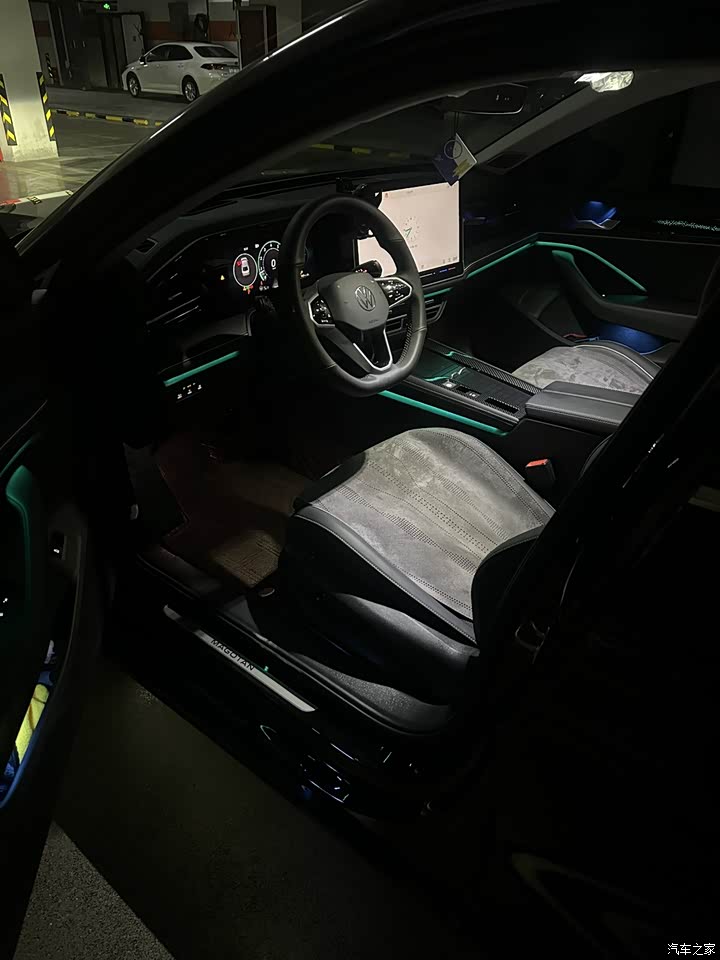 4米99的车长,气场十足,19寸的大脚动感十足也是!贯穿式的前灯和大众标点亮后很有档次感,尾灯3种动画效果也很有科技感,晚上开车出去吃饭的时候让我很有面子。矩阵大灯,逼格拉满,这迎宾照地灯也是大气了不少