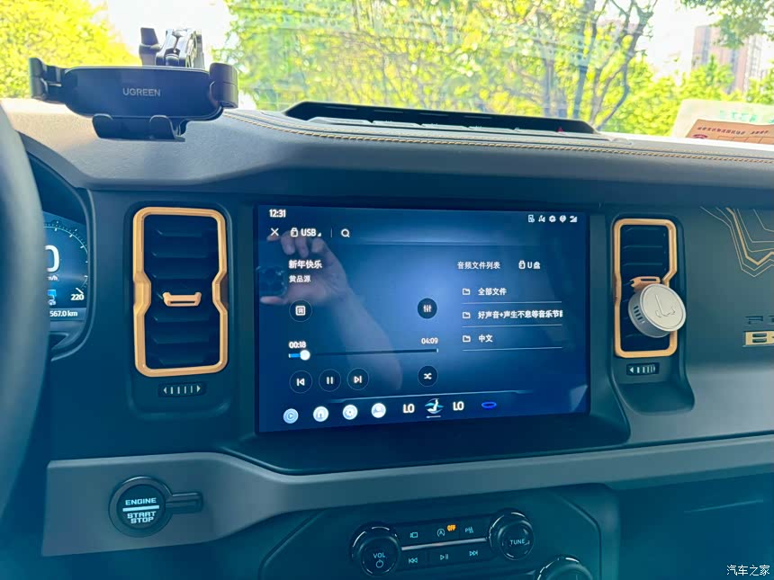 由于我选的是荒地版本,内饰是有拉花的,个人感觉并不突兀。材质方面主要是硬塑料配合麂皮中控台,中控台上有1/4螺丝孔和两个充电口,可以很方便的连接外部设备,于是自己diy了导轨和手机架,还是很方便的。