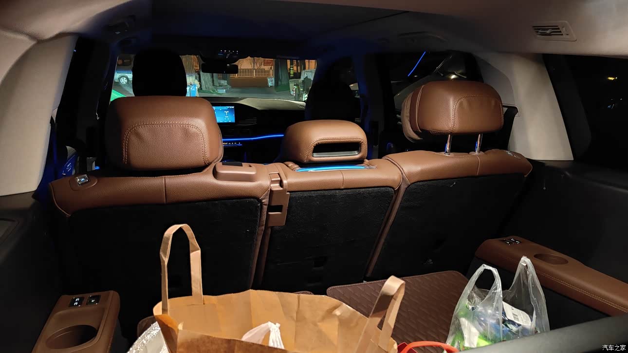 全尺寸三排座SUV的空间是它的核心竞争力。以我176的身高,第二排腿部空间有两卡以上的余量,头部空间充裕。第三排对比同级竞品表现出色,短途乘坐成年人不成问题。储物空间丰富,门板储物槽足够放入大号水瓶,中控台下方设计了容积可观的无线充电储物格,扶手箱和手套箱空间也都十分实用。行李厢的装载平面相当平整,可以轻松搬运大件物品。