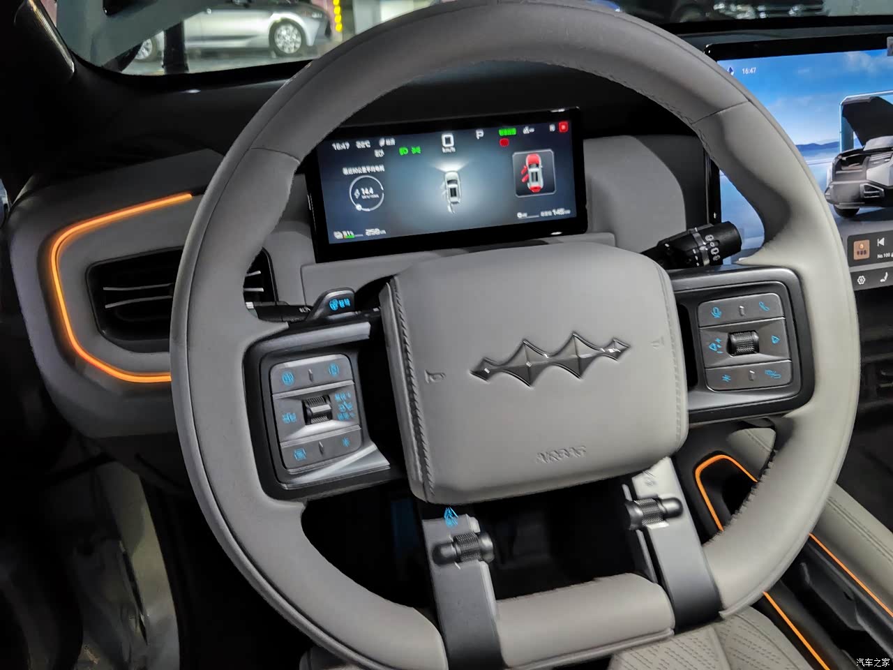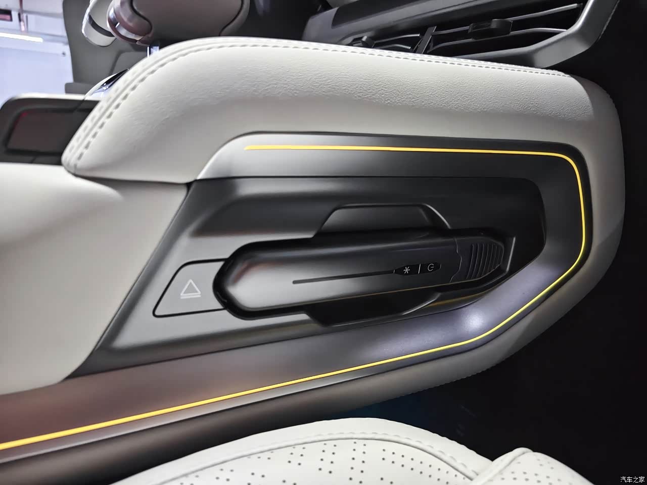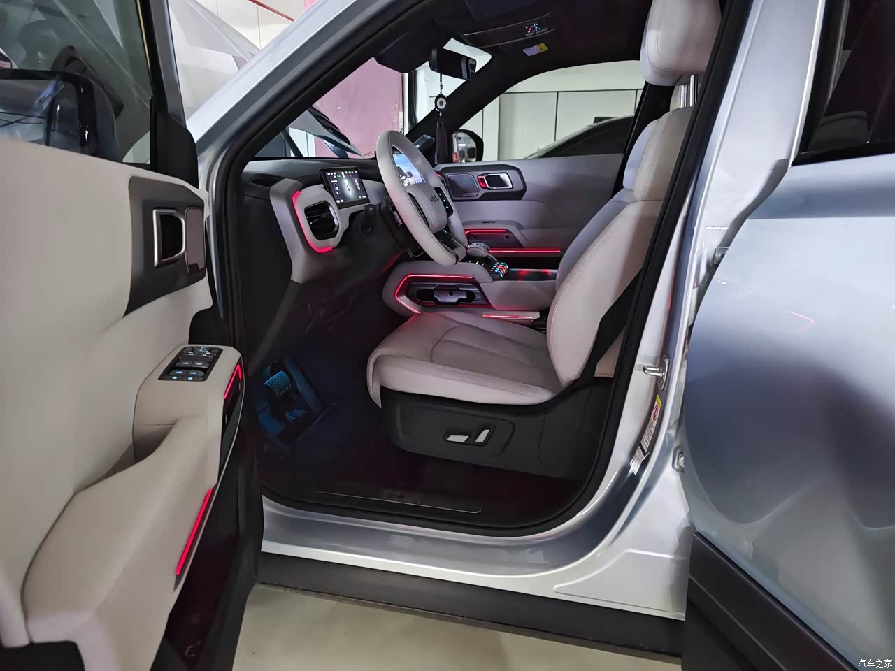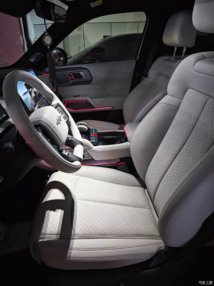 豹5同款中控台,真的很好看,虽然没有升降,但是仍然很有仪式感。 大面积软包,触手可及都是皮质手感,这个价位top级别的了。 氛围灯虽然少,但是点缀效果不错,我也不太喜欢大面积rgb,太多就迪厅风格了。