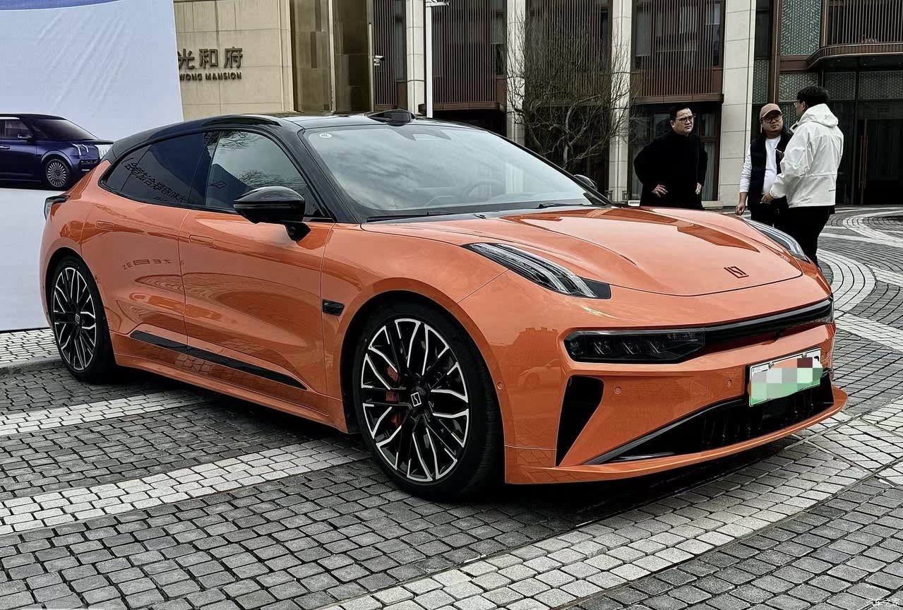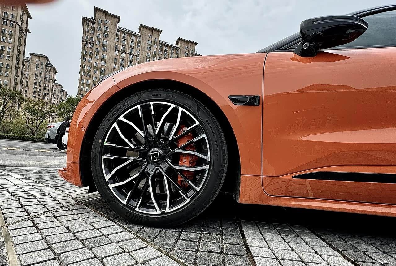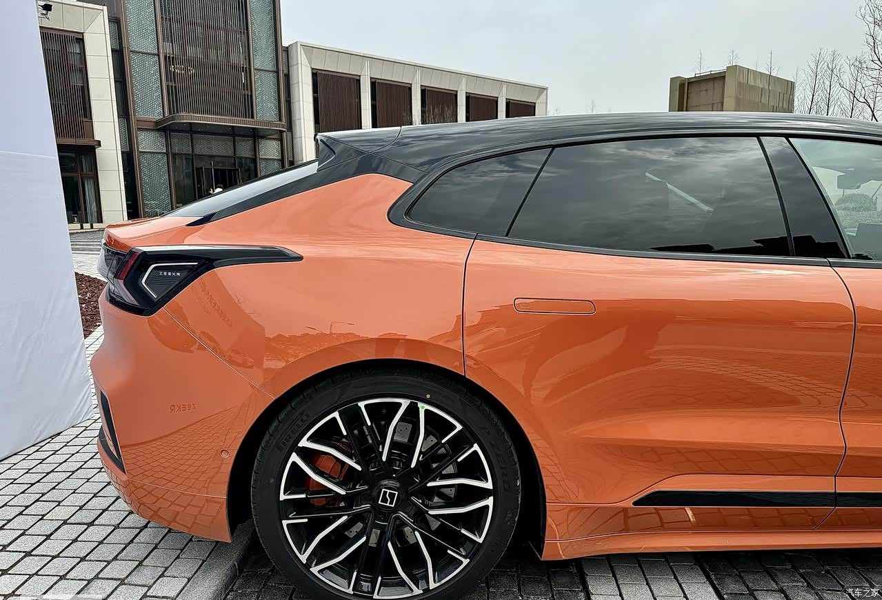 试驾车外观颜色是驭光橙,搭配了黑顶,猎装风格凸显,前后车身4977mm,车宽1999mm,轴距达到了3米多,光看长度和宽度,数值绝对拉满,但整体看上去不大,比较低趴,前面底盘比较低,不过有空气悬挂,这点无碍,再加上溜背设计,整个造型可能风阻系数更低。四门都是无边框车门,视觉感很酷,但是是单层玻璃,后排为隐私玻璃,22英寸多辐运动锻造轮毂,前轮搭配Brembo六活塞卡钳和Brembo大尺寸打孔通风盘,提高了散热性能,使制定更灵敏,从整体外观而言,这绝对是一台年轻运动,富有激情的猎装轿跑。