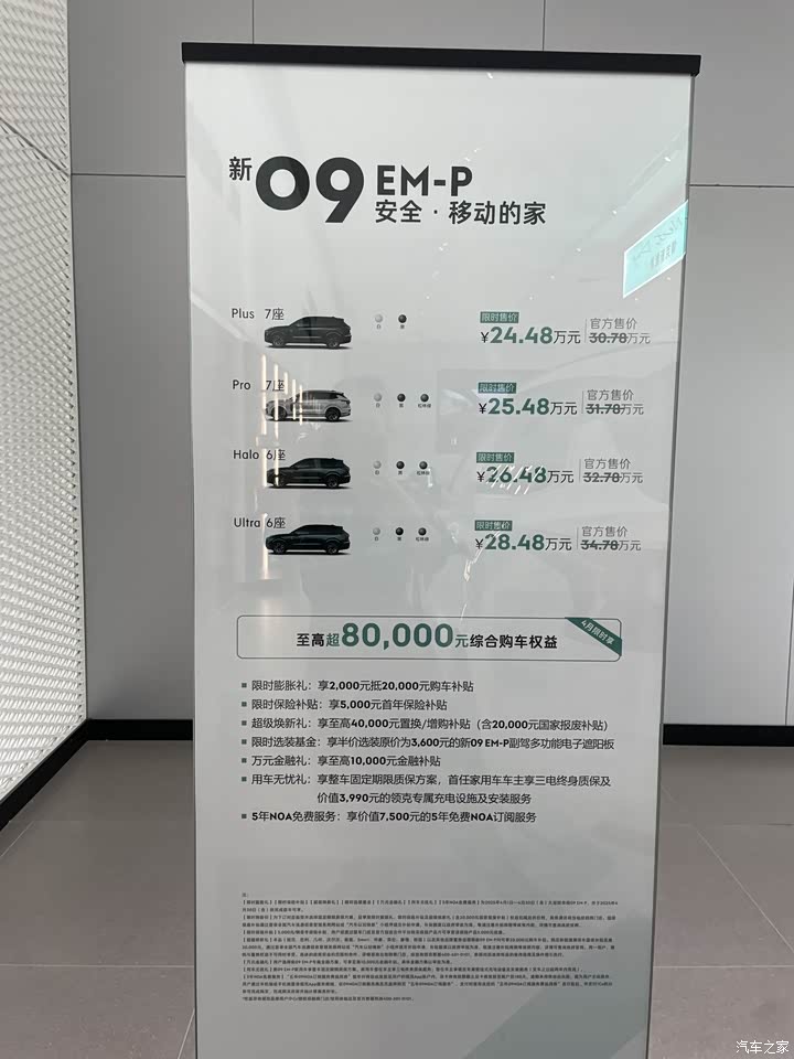 销售很细致的给我介绍了现在的价格政策,还是比较心动的,最高可以享受8万,全系车都控制在了30万以内。最低PLUS 7座 24.48万,最高Ultra 6座28.48万。