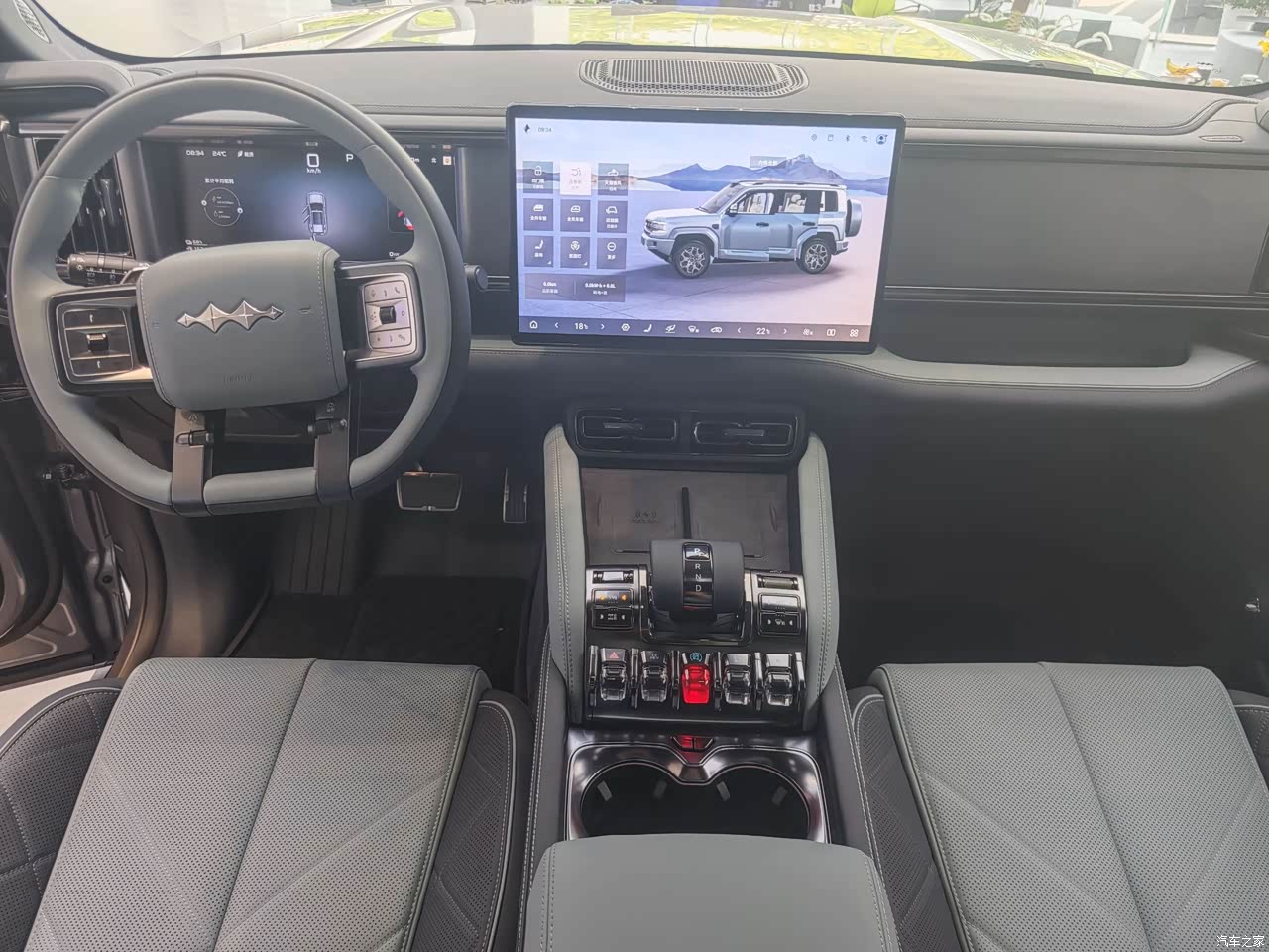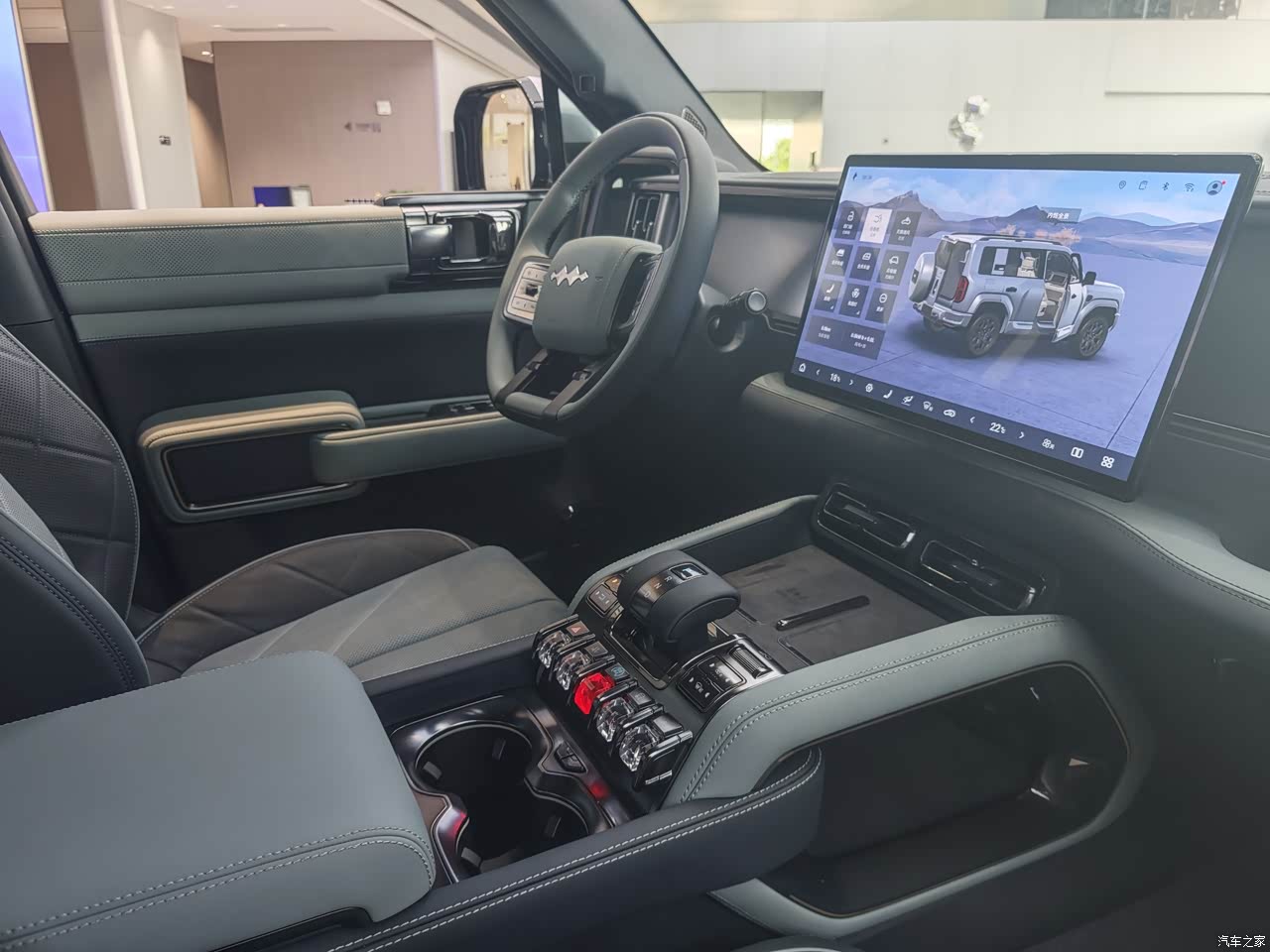 一拉车门,我惊了!这内饰比我家沙发还讲究。座椅软得能陷进去,门板上还包着翻毛皮,中控台摆着三块大屏幕,跟不要钱似的。最贴心的是,空调、差速锁这些关键按钮都保留了实体键,盲操作毫无压力——这点必须好评,毕竟谁也不想在越野时对着屏幕戳来戳去。