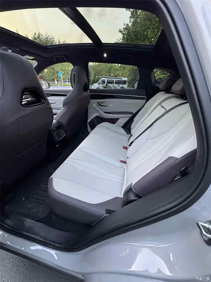 这款车的空间表现可圈可点:前排座椅宽大舒适,驾驶位置头部空间充裕。后排腿部空间接近两拳,地台几乎纯平,三人乘坐也不会拥挤。 储物空间:门板、中控台储物格设计合理,手机无线充电板、杯架都很实用。唯一不足的是后备箱,受电池影响,容积比燃油版略小,但日常家用仍然够用。