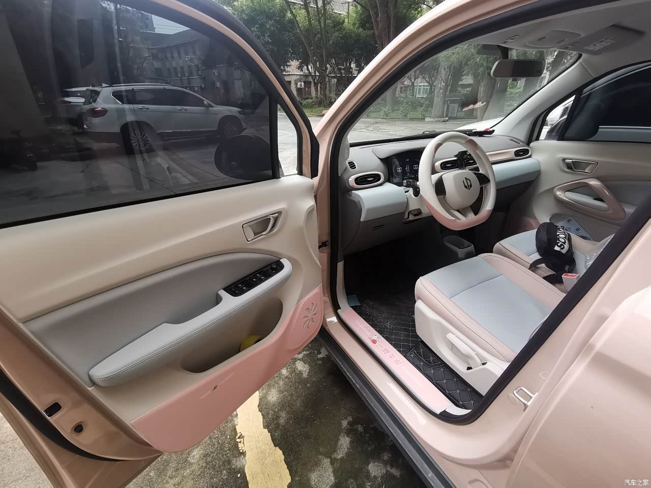 媳妇一眼就被这个海盐蓝内饰吸引了,要求必须选这款内饰,确实看起来很清新,缺点是不太耐脏,虽然是A0级小车,门板处也做了一部分软包处理,还是可以的
