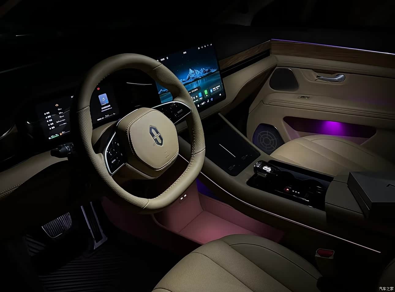 中控台、门上都有用皮质包裹,奢华感十足,大屏加上星环散射体让整个座舱都有科技感,再加上氛围灯和香氛系统,虽然说是家用车,但也不缺乏精致格调。
