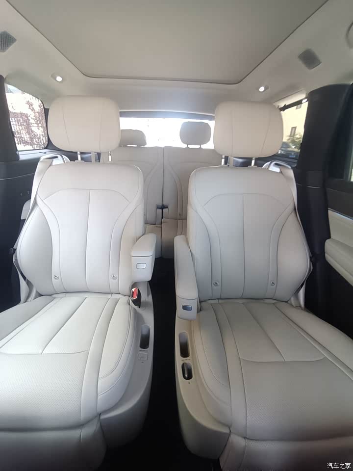 这款车车长超了5.2m,轴距3.3m,提供了同级最宽裕的横向和纵向空间。第二排是独立的航空座椅,腿部的空间超了1m,还支持腿托、拷贝、扶手多向调节,头等舱的体验感拉满。方正的车顶设计结合全景天幕,使得头部空间超了1m,这对于高个子的人来说是很好的优势。