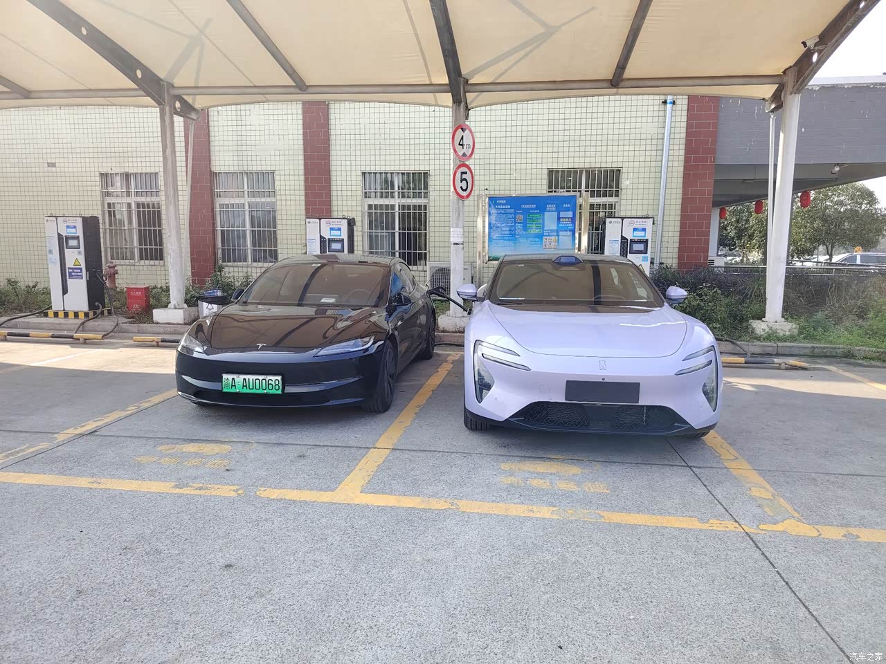 外观也算是阿维塔06的一大亮点,家族化的前脸设计,依然帅气。但“屁股”这种双层设计略显突兀,欣赏不来😂,但还好双色车身。有张照片是在服务区充电,刚好旁边停了一辆某3,就顺手拍了一张。感觉无论是颜值还是尺寸都是碾压某3。