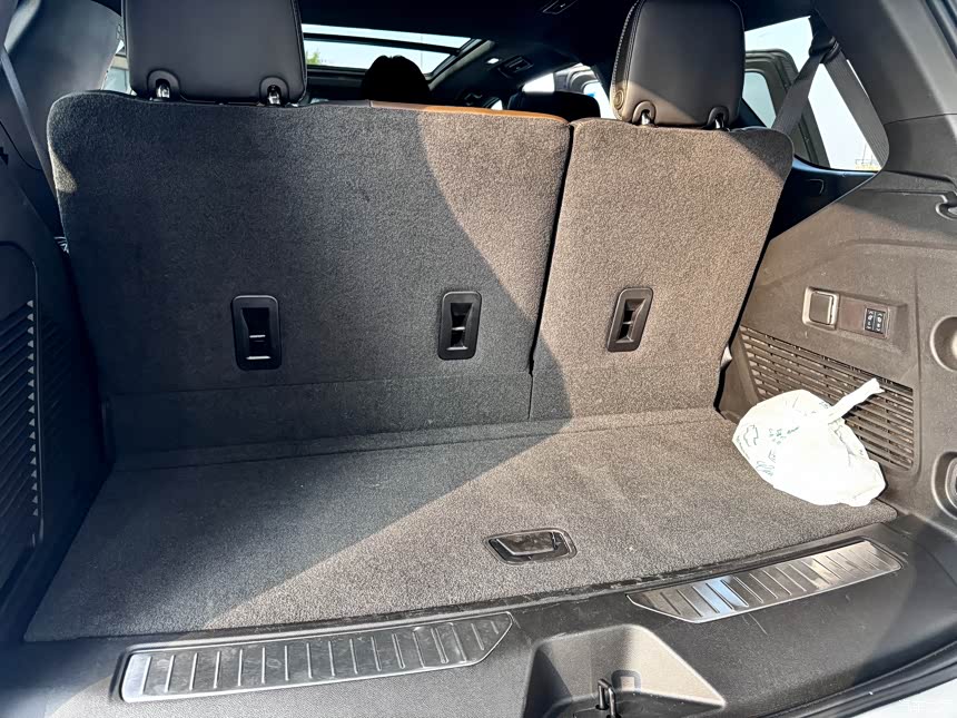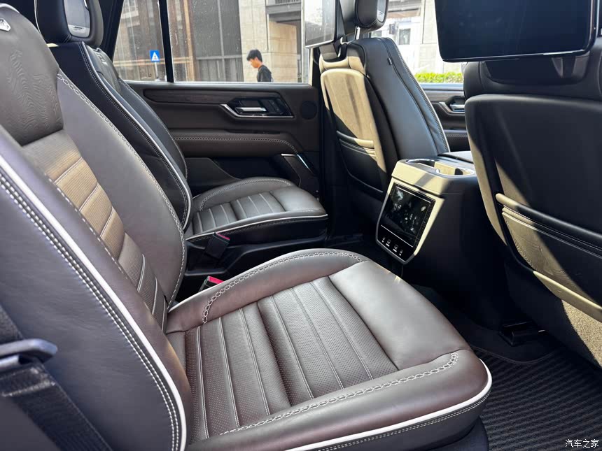 得益于3071mm的超长轴距,三排座椅空间都非常充裕,顶配巅峰版的前两排座椅都是单张的座椅,功能上电动调节、通风、加热、按摩全配置上了,坐垫厚实,是传统的美式大沙发乘坐感,久坐不累,后备厢空间很规整,放下五个登机箱没有任何问题。