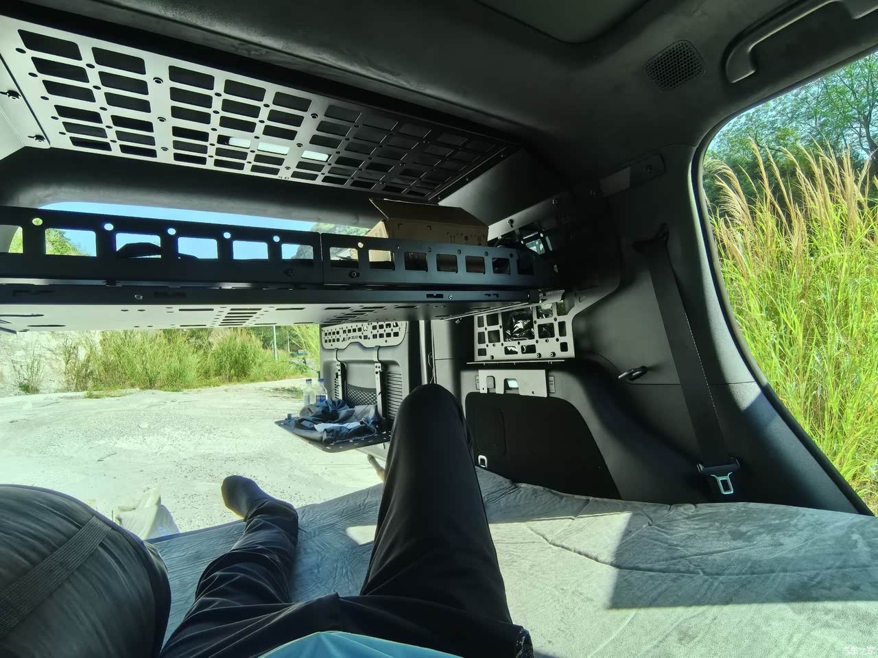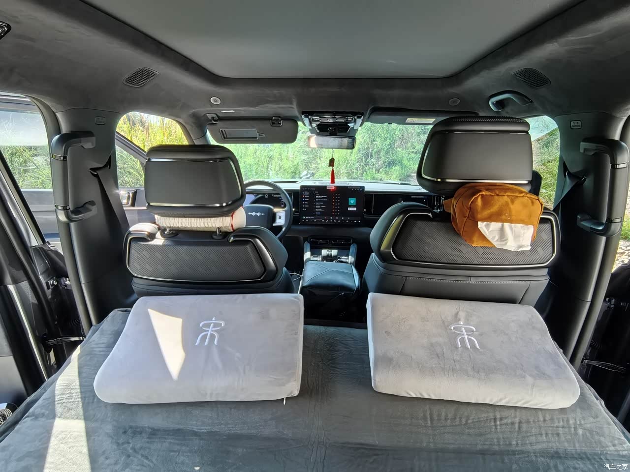 空间虽然尺寸够大,但是二排放倒以后,有一点点坡度,且后备箱长度不足1.7米,床车模式需要配合床垫才能躺平,车内能坐直起来。总的来说露营床车模式用起来还是非常舒服的,好评!