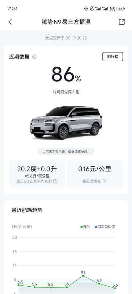 之前开的是一台马自达CX-5,15年买的,当时办下来接近20W(感谢自主品牌把合资车价格打下来),开了整整10年了,很好开,操控性很好,东瀛宝马确实有点东西,换车因为确实有点落伍了,智能性几乎为零,每次开长途都很累。确定买腾势N9之前,前前后后也对比了很多车,包括GLC、X3、Q5,随着新能源车渗透率逐渐提高和智能化做得越来越好,逐步把眼光转移到国产新能源车,纯电还是觉得当前长途有续航焦虑,所以锁定了插混和增程,一度很喜欢理想L7L8,24年初试驾了L7,当时老款优惠很大,但本着买新不买旧的原则,选择等新款,24款上市后升级挺大,不过优惠没有了,想着等等优惠(想起了不买哥,新款出来等优惠,优惠出来等新款),没下定主要因为试驾时LD坐后排晕车比较严重,一等就到了去年底,问界M8、腾势N9也开始预热了,一度又很钟情5座M8,也下了小定,LD也比较满意,没买是因为跟我小孩说我们打算换问界M8,他问有几个座位,我说5个,他说太少,他想多几个座位好让同学朋友些一起坐,又问有没有后排娱乐屏,这是他最看中的功能,这么一来M8价格来到了42W,还不包括智驾1W和选装(个人觉得至少选一个星云红内饰,加装一个电踏),这样的话M8有点超预算且这个价格性价比就不高了。 N9出来前先看了Z9,当时觉得外观内饰都还可以,用料很扎实,后轮转向对大车也很实用,就等等看N9,后来N9上市了,比心里预期的价格要高了一点,但对比友商后,性价比还是比较突出,也去试驾了,被4.6米的转弯半径惊艳到了,比我原来的CX-5转弯半径还小,智驾也试了,觉得够用,所以思前想后还是定了N9,本来想低配选装一个后排娱乐屏就可以了,但选装后排娱乐屏要等到6月份才开始生产,等不及了,旧车已经卖了,所以一步到位定的顶配,高配即满配,无任何增项。 下定N9后大概等了3个星期,五一节前两天app显示车辆已完成生产,正好旧车卖了,五一也没打算出去玩,就去验了车,外观选的雪玉莹,内饰选的铂檀灰,整体没什么问题,节后第一天交的首付,第二天贷款下来了就去提车上牌了。 提车到现在开了2个星期左右,累计开了1000公里,期间有趟600公里的长途,整体使用下来符合预期,用车成本低,纯电的话合不到0.1元一公里。纯电续航标称CLTC202公里,实测下来城区能超过200公里,比较实,我每天通勤也就20公里左右,基本可以做到一周一充。智驾高速用了一下,基本不用接管,大大减轻旅途劳顿,而且很平稳,小孩子坐在后面唱着歌,看着娱乐屏,非常轻松惬意。