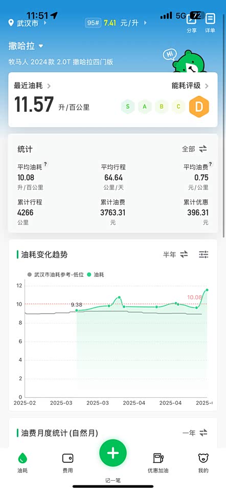 两吨多的车重,AT胎,我之前心理预期油耗是12个左右,结果各种路况开下来,平均10个,确实很满意。最近一次油耗很高。是因为去跑了一次山路,爬山油耗确实很高。