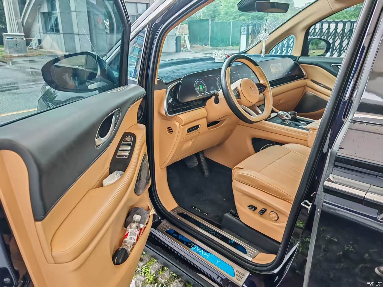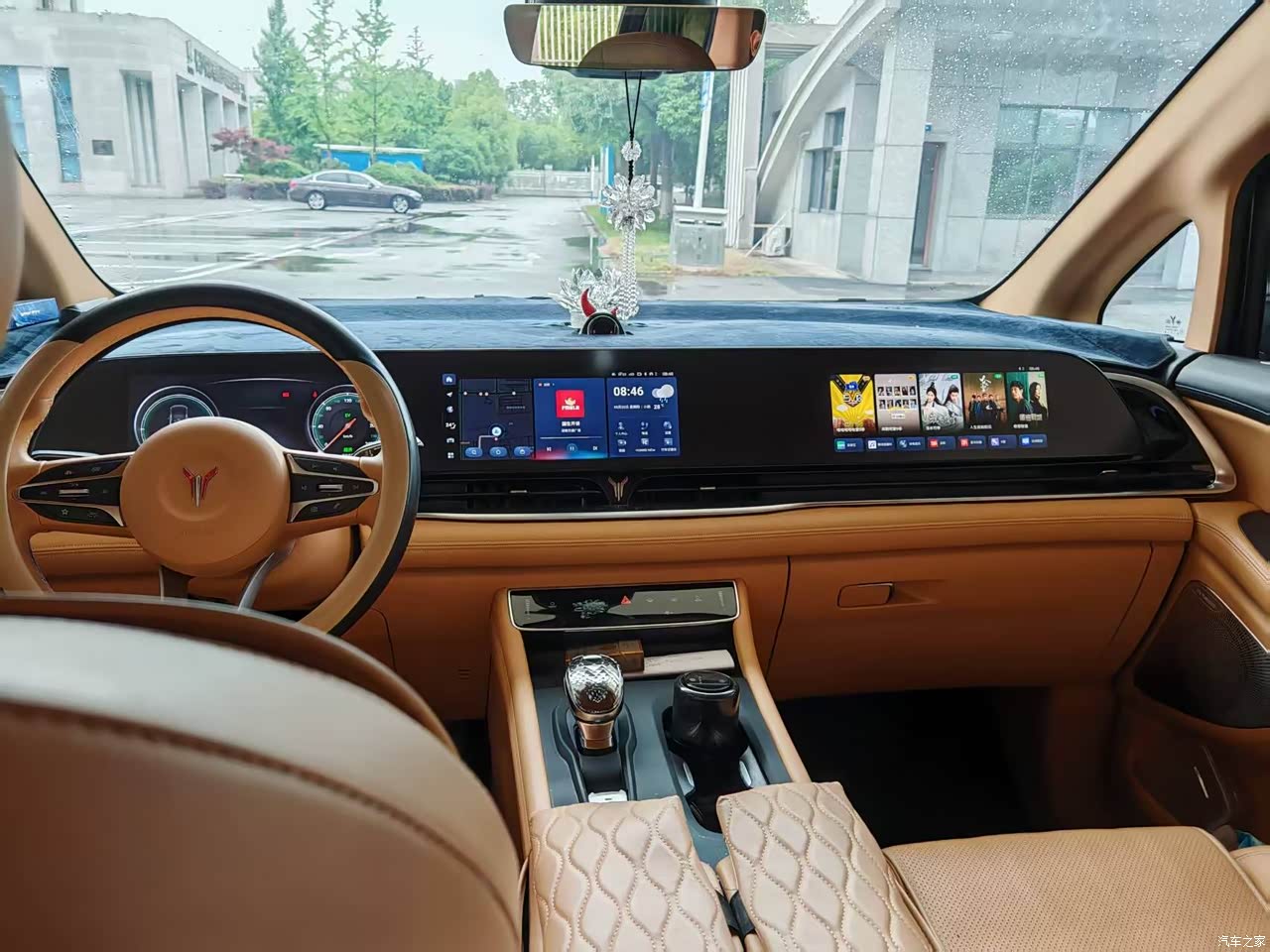 映入眼帘的就是三连屏,就是屏幕有点小,副驾看电视没有大屏的舒服,座椅材质还可以,新车没有特别的异味。实体按键还蛮多的,这点挺好,对于燃油车过渡过来的很友好。前排就是缺少了hud,很羡慕别的带hud车型。前排手机带手机无线充电,就是有时候开快了,不太稳定,手机有时候会飞出去。二排,有电视,配合二排座椅,放倒后看电视很舒服,孩子十分喜欢。
