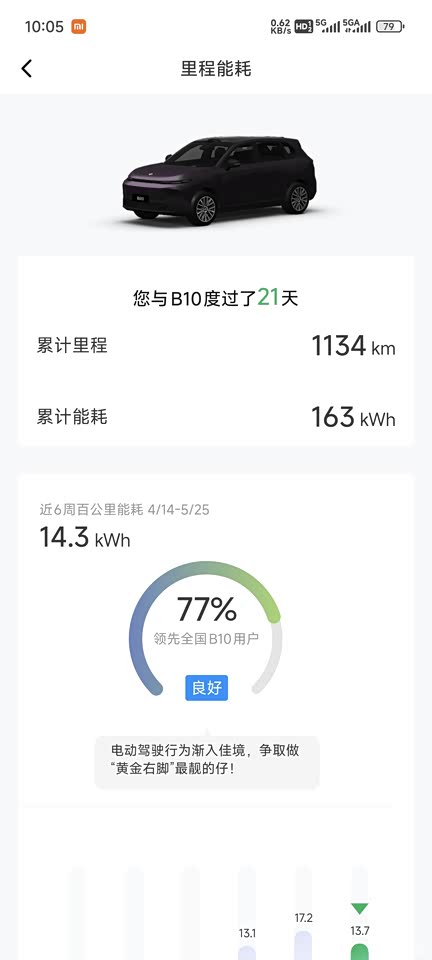 续航这方面比较考验开车人的脚感以及动能回收的开启力度。本人喜欢开快车,并且动能回收开到最低的情况,能耗在14.3KW/H每百公里。可以说可圈可点。