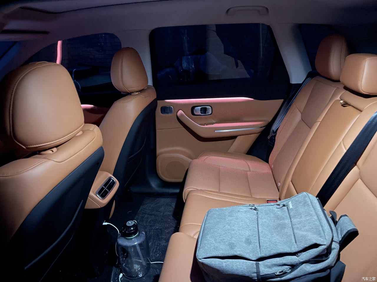 空间很大,作为主力家庭车使用一家人坐上去一点感觉不到拥挤。前排主副驾座椅可以180度放平,和后排连在一起就是一张双人床,再把天幕打开就像躺在草坪上。 后排腿部空间很充裕,可以跷二郎腿。
