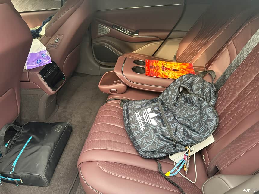 乘坐空间宽敞,储物设计有取舍 大轴距带来奢侈的后排腿部空间(1.85米身高仍有2拳余量),纯平地台提升舒适性。但前排调至最低时头部空间仅1拳,低坐姿需适应。 豪华配置丰富,细节待优化 - 副驾零重力座椅、后排通风/加热/按摩、双冰箱(前4L/后10L)等配置拉满豪华感; - 但后冰箱实际仅容纳6瓶水(标称8瓶),零重力座椅腰托充气噪音大;