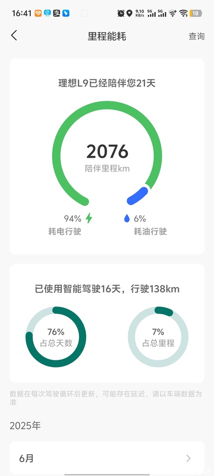 车辆目前里程达到2076公里,跑的比较多,总体下来我和老公的体验感还是不错的,平时在公司午休的时候,想要找个安静的地方躺一会,直接可以到车上打开小憩模式,车上的座椅会自动调整好,设置好休息时间,就可以躺着刷视频,刷累了就闭目养神,感觉车子已经是自己的第二个家。下班回家的途中,通常是老公在前面开车,我在后面打开后排娱乐屏,打开自己正在追的电视剧,可以用皇后座椅躺着看,感觉非常惬意!老公则听着铂金效果的音乐,悠哉悠哉的打开智能驾驶还有座椅按摩,比以前的开油车时轻松许多。车子开着也平稳,现在已经升级了魔毯空气悬架,没有什么颠簸感,坐的时间长了也不觉得累。没体验过这个魔毯空悬的小伙伴们建议去预约试驾一下,真的是惊艳到我了哈哈。至于能耗,我家里是有停车位,所以就安装了理想的家用充电桩,开通峰谷电之后可以预约晚上10:30充电,这点很nice,以后城市内出行光用电就可以到处跑了,没有心理负担,现在出门吃个饭,明明可以骑电瓶车去,非要开着车,因为新车买来总想着开😂再一个让我不得不夸的是理想的人机交互真的很智能,现在还升级到能帮点咖啡,前后双音区等等,细节感满满,让我觉得这才是科技服务于人类的意义。