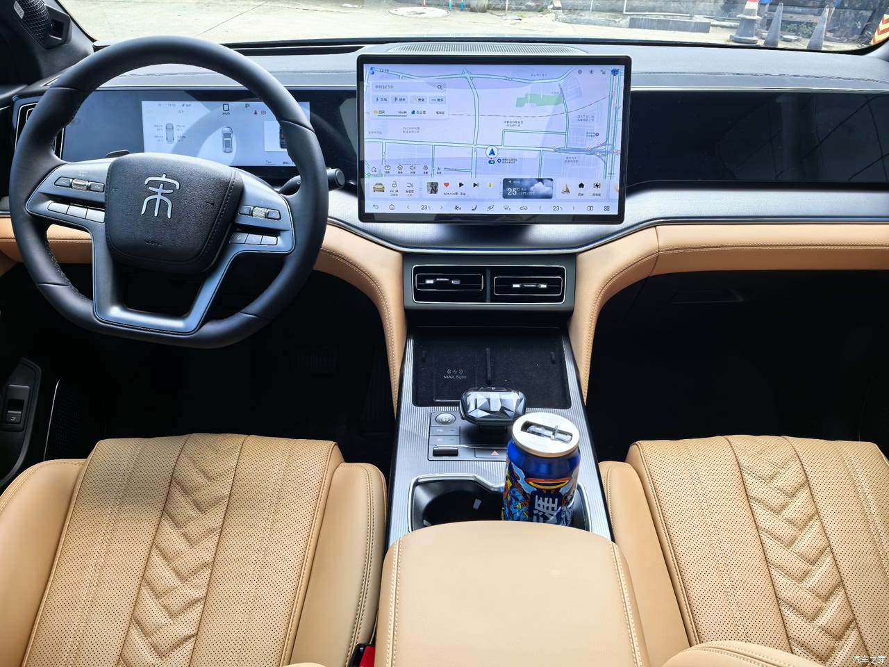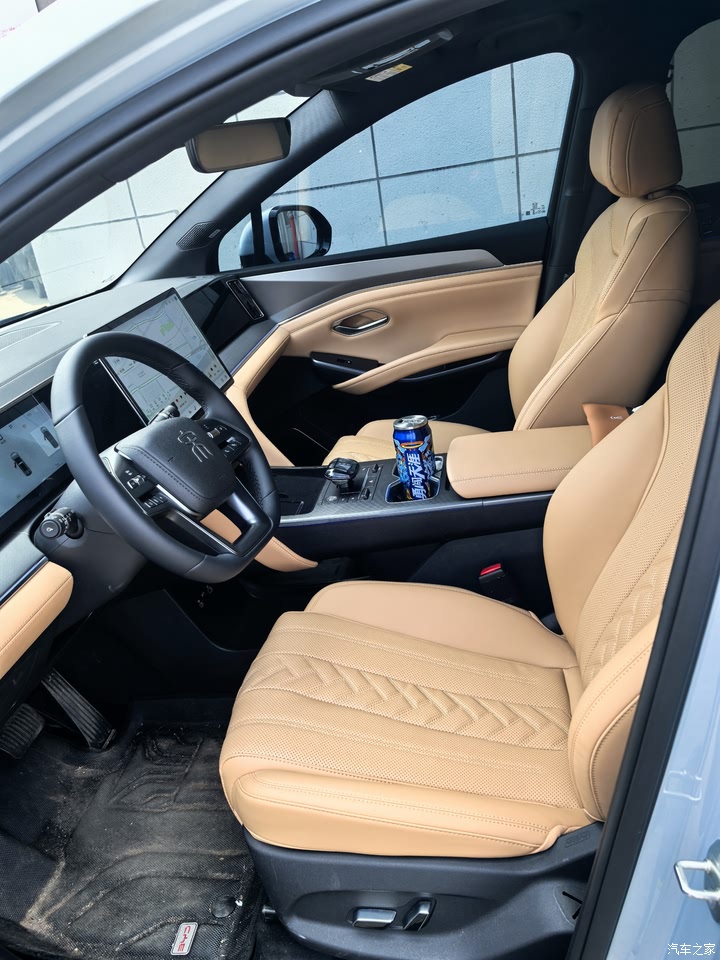 宋L的内饰是走简约大方又有质感的路线,浅棕为主色调主打温馨和居家感,座椅皮质看起来细腻,纹路规整显精致;中控布局简洁,大屏、实体按键搭配合理,操作顺手,整体营造出舒适、实用又带点科技氛围的驾乘环境,日常用着很 “对味”,没有花里胡哨的设计,却把家用车该有的温馨、便捷都给到了。